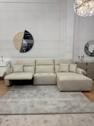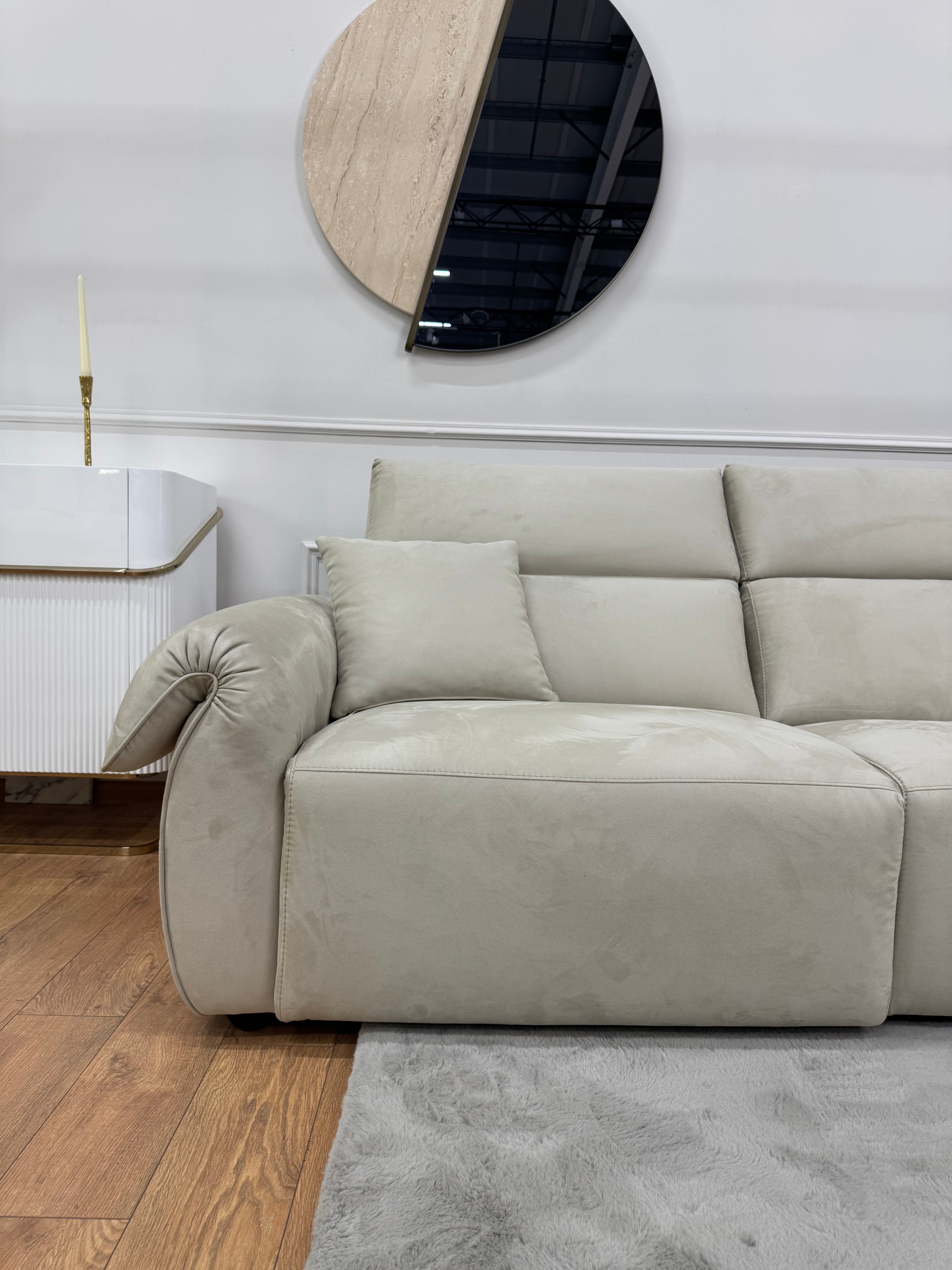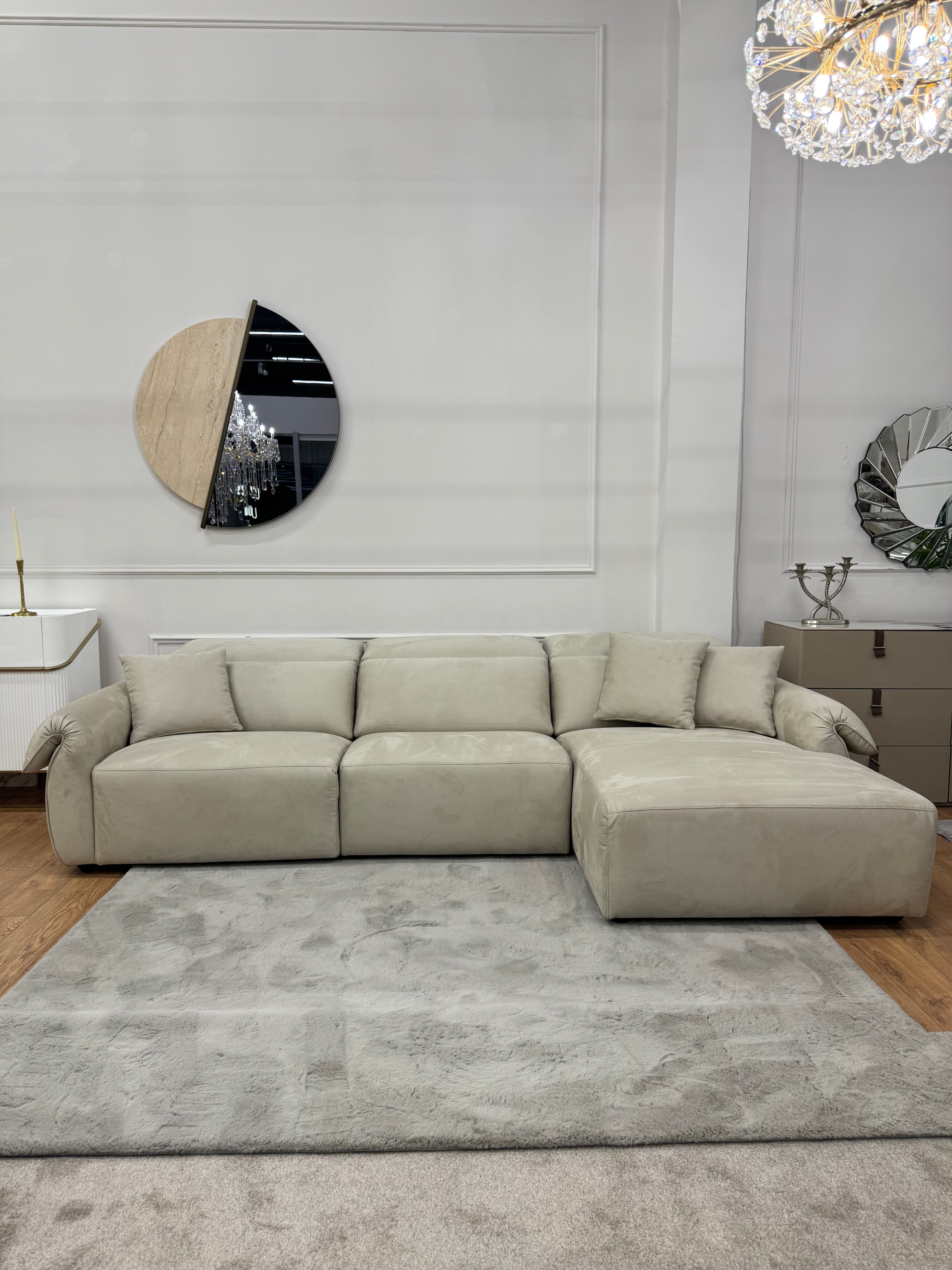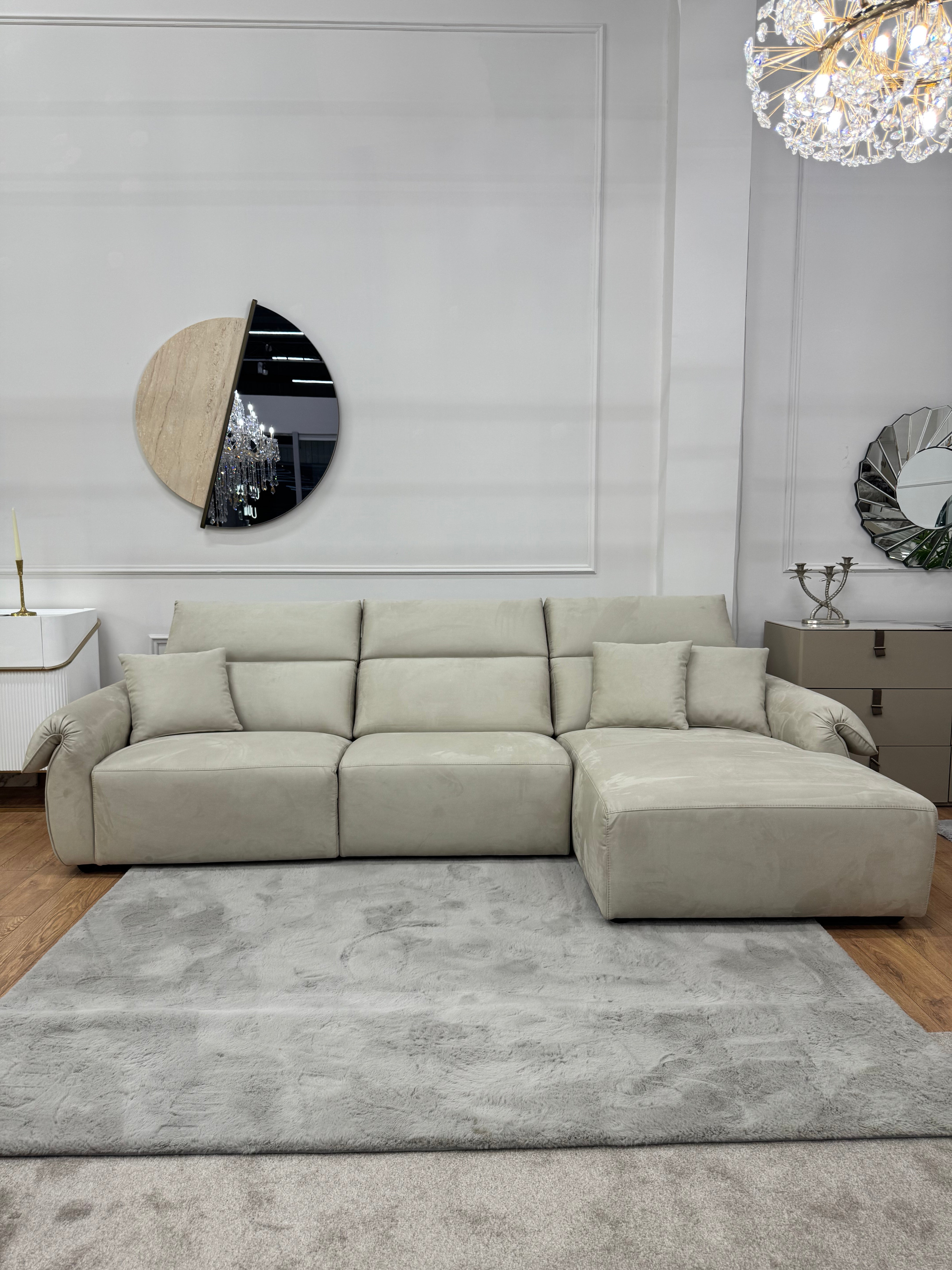 Сучасний кутовий диван з глибокою, м’якою посадкою та розслабленою формою. Модель поєднує широкі підлокітники, комфортні подушки та простору шезлонг-частину з правого боку.