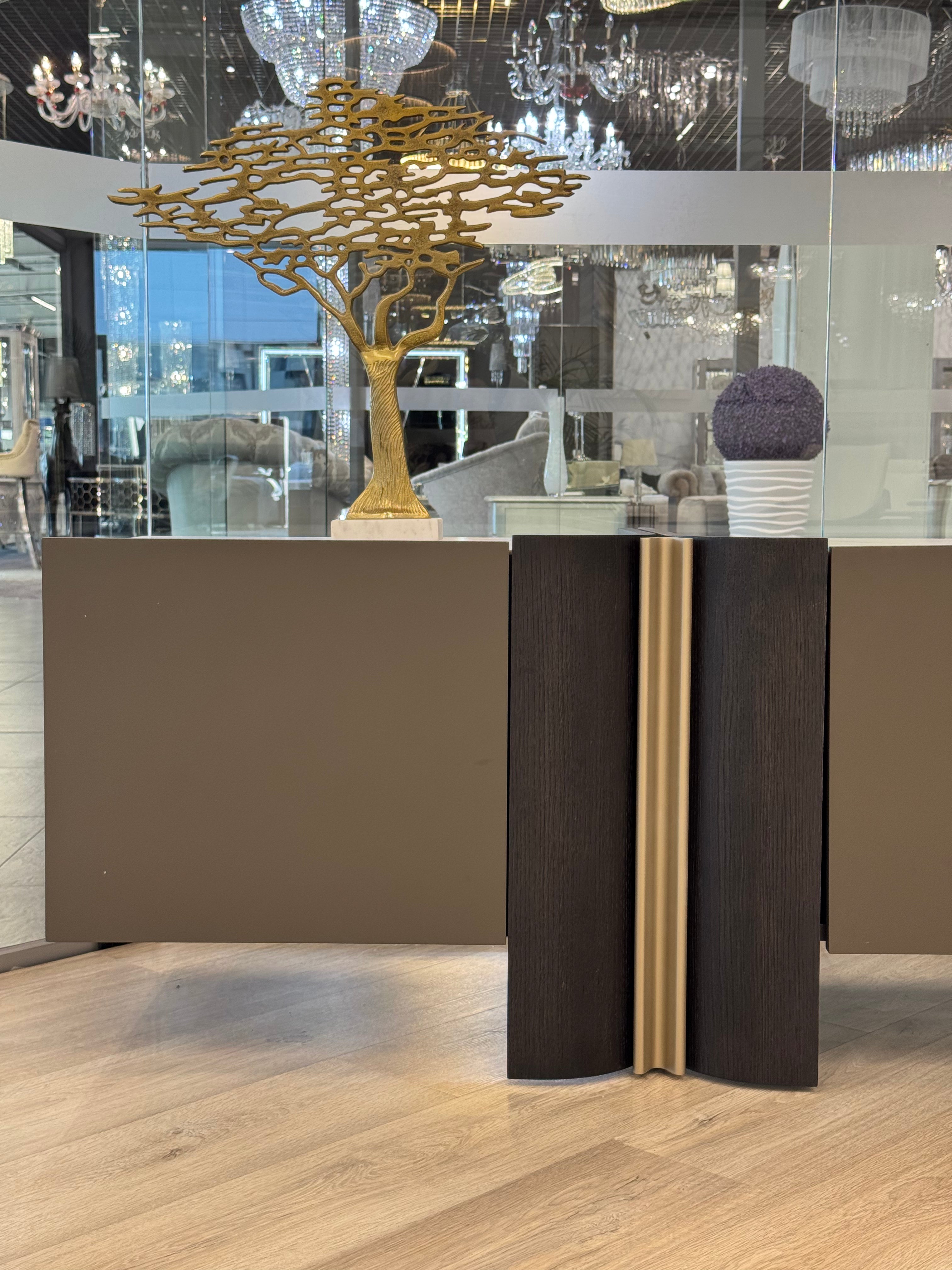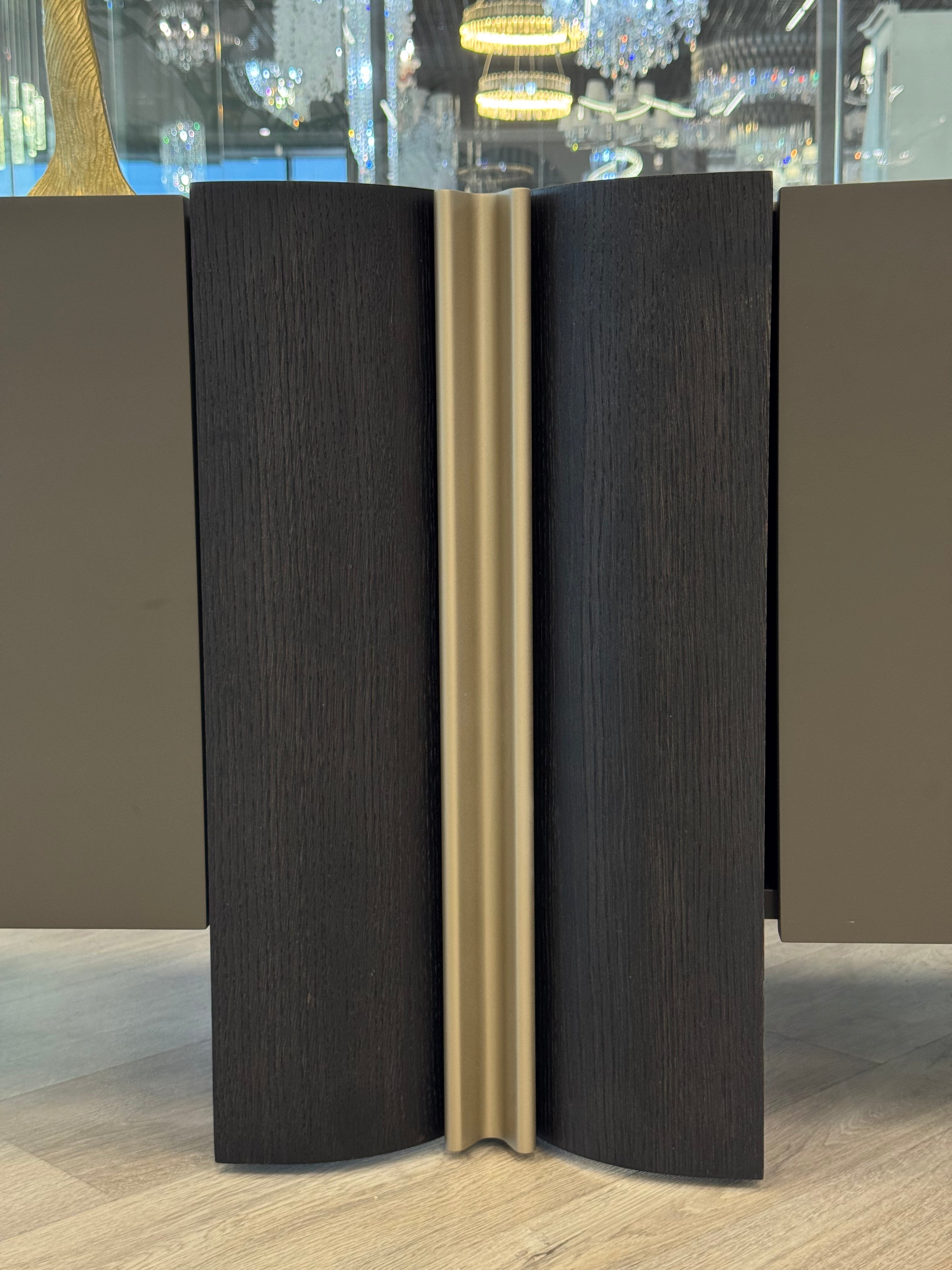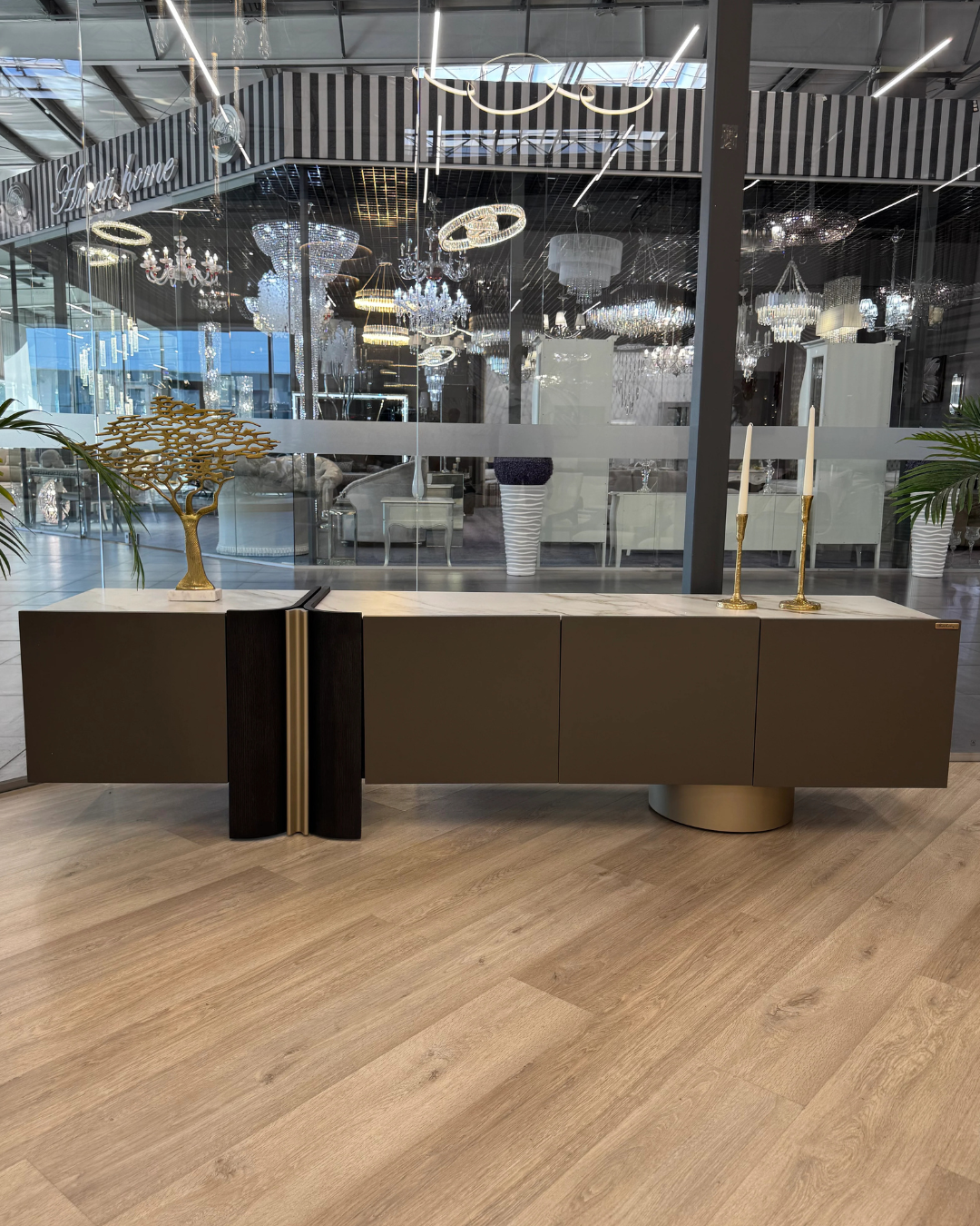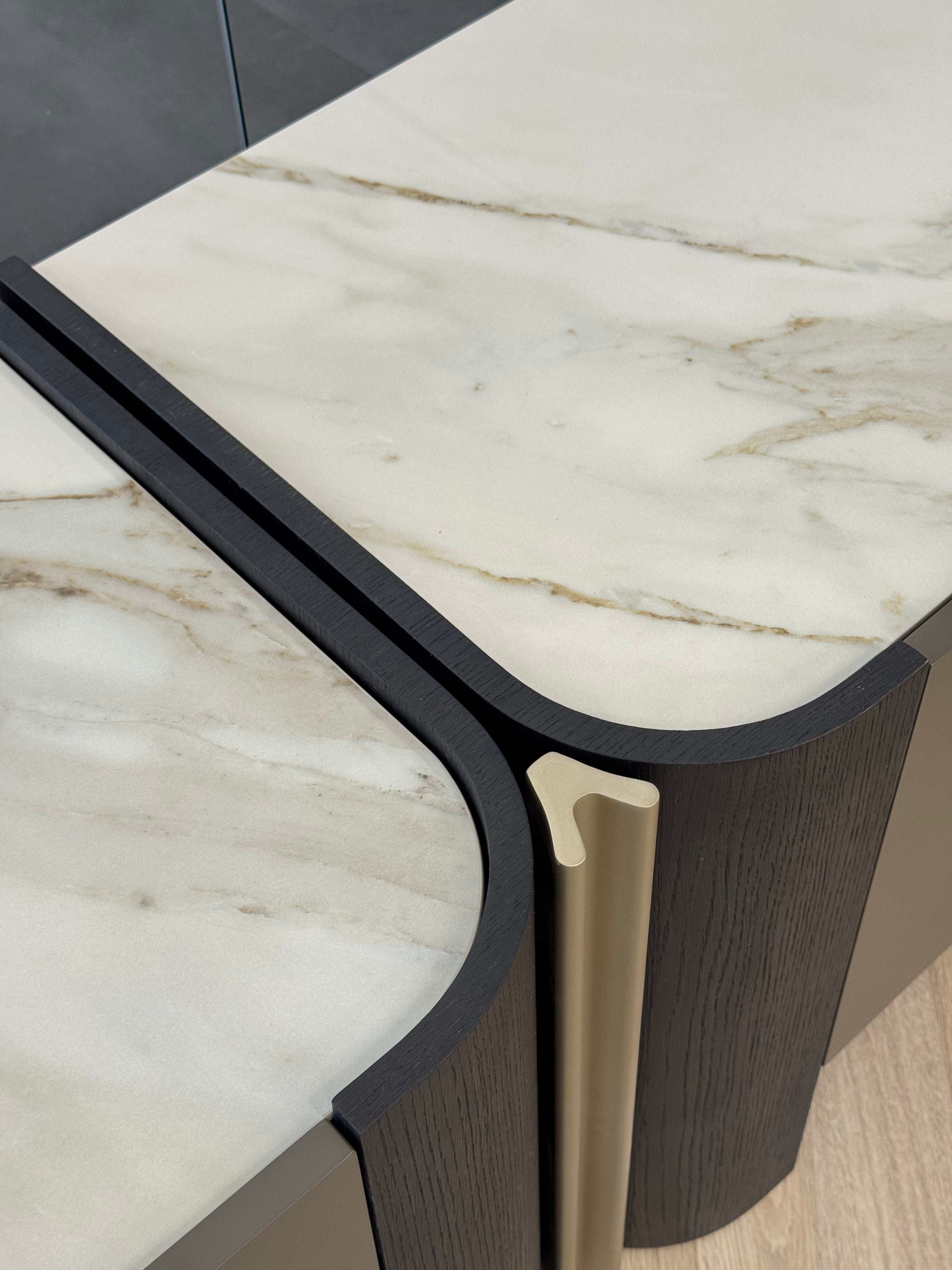 Лаконічні фасади у глибокому оливковому відтінку поєднуються з масивною мармуровою стільницею, створюючи відчуття стабільності та вишуканості. Центральний акцент у вигляді дерев’яної вставки з металевою деталлю додає характеру, підкреслюючи преміальність Pierre Cardin у будь-якому інтер’єрі.