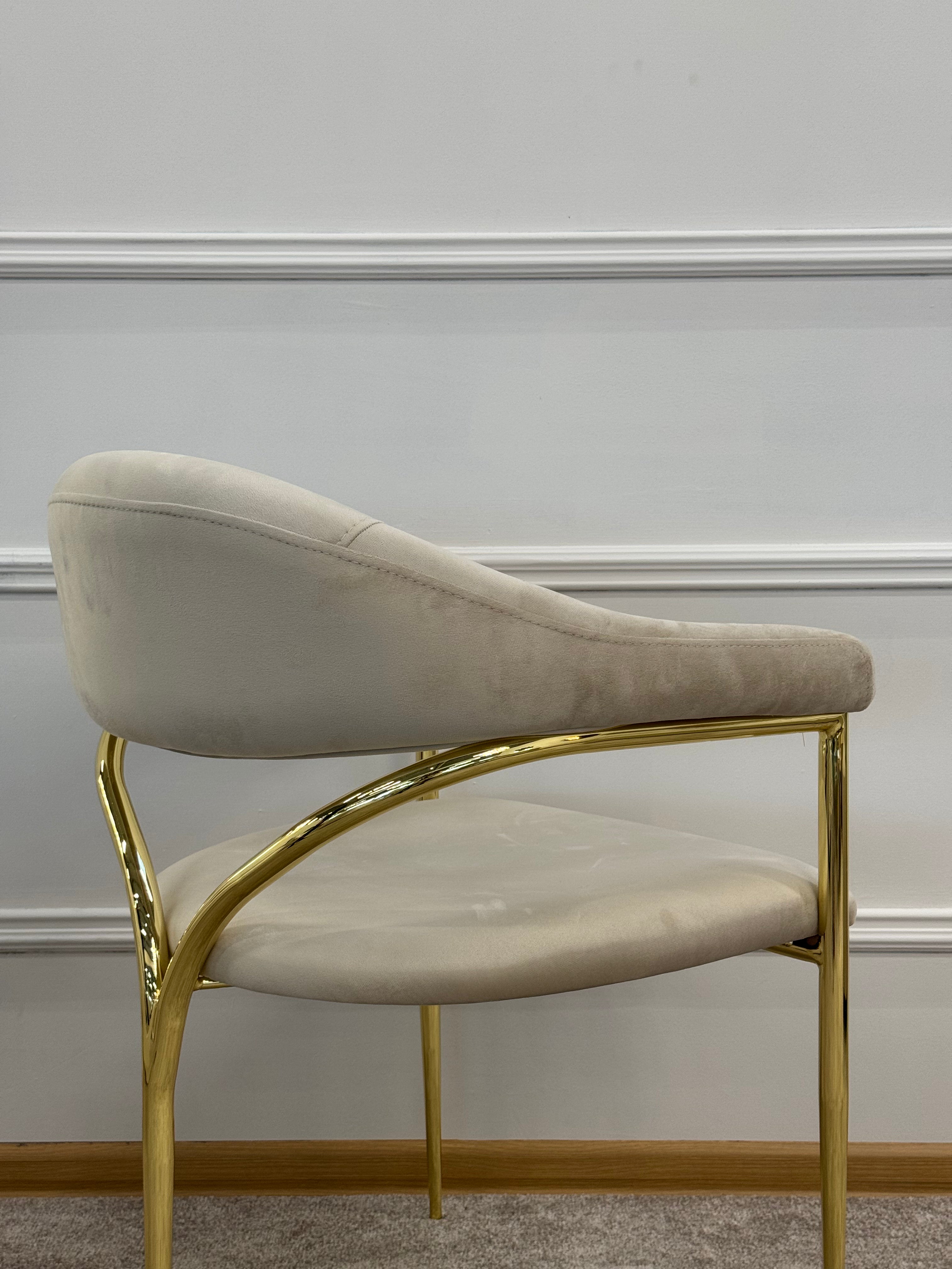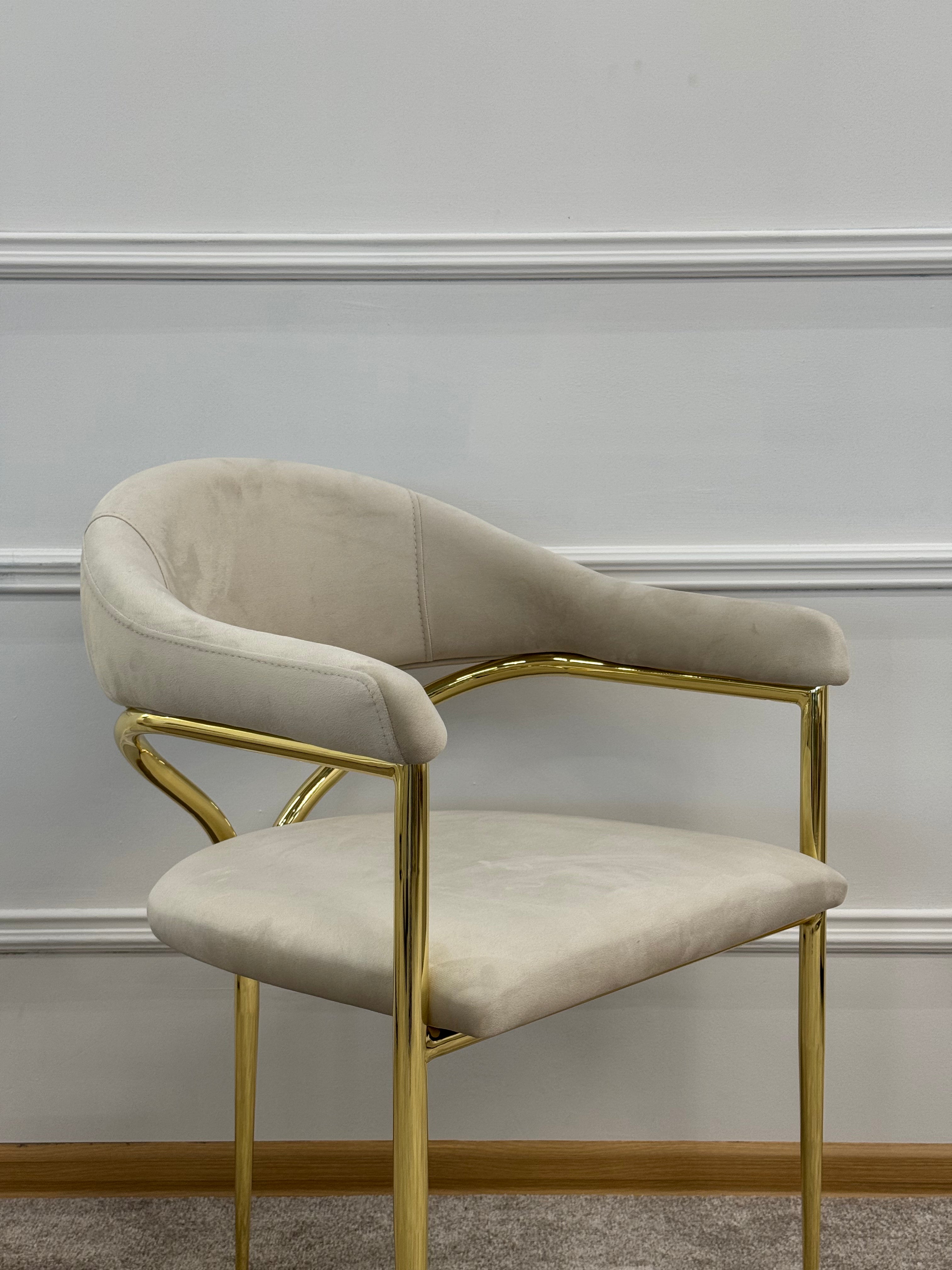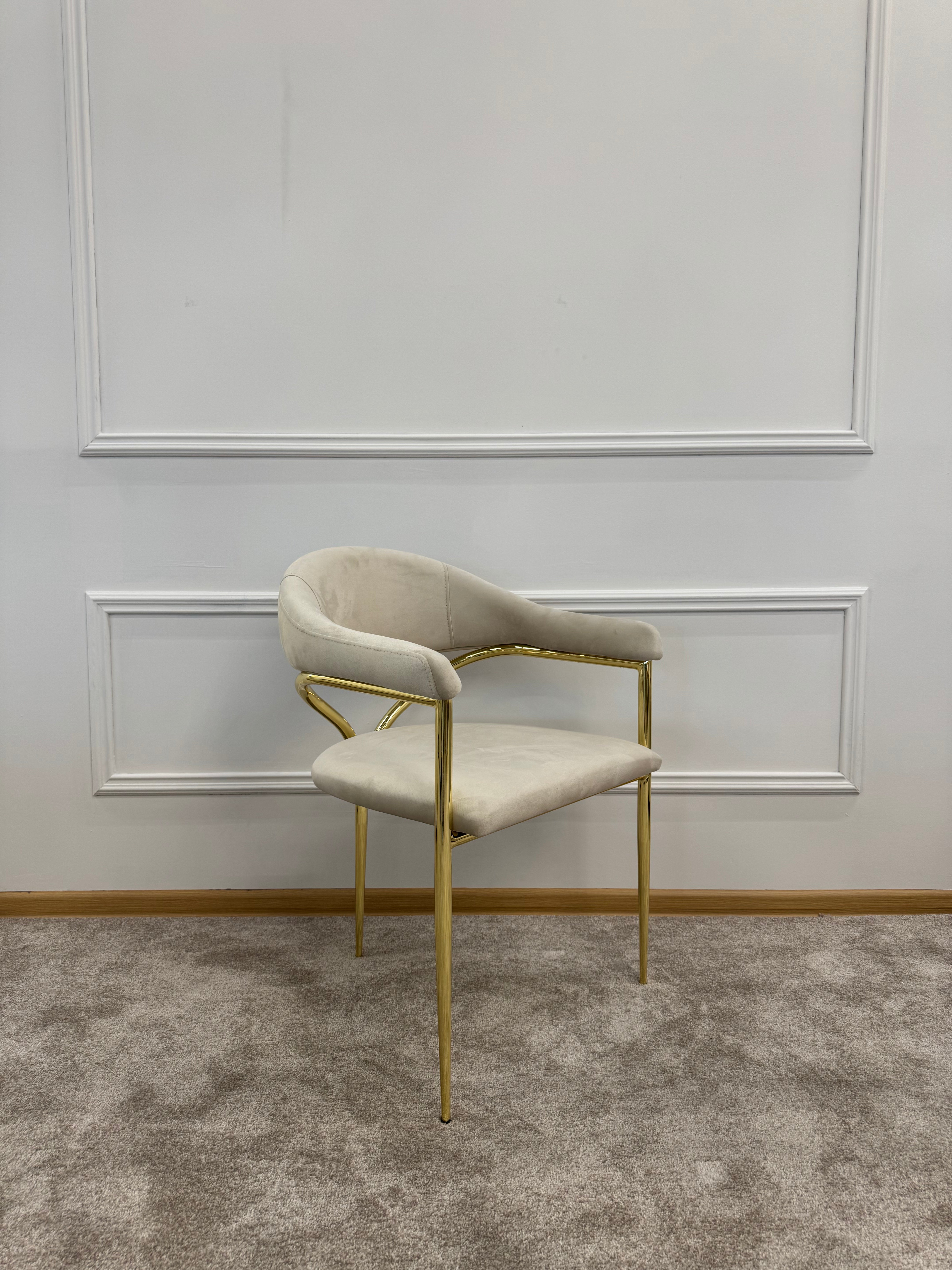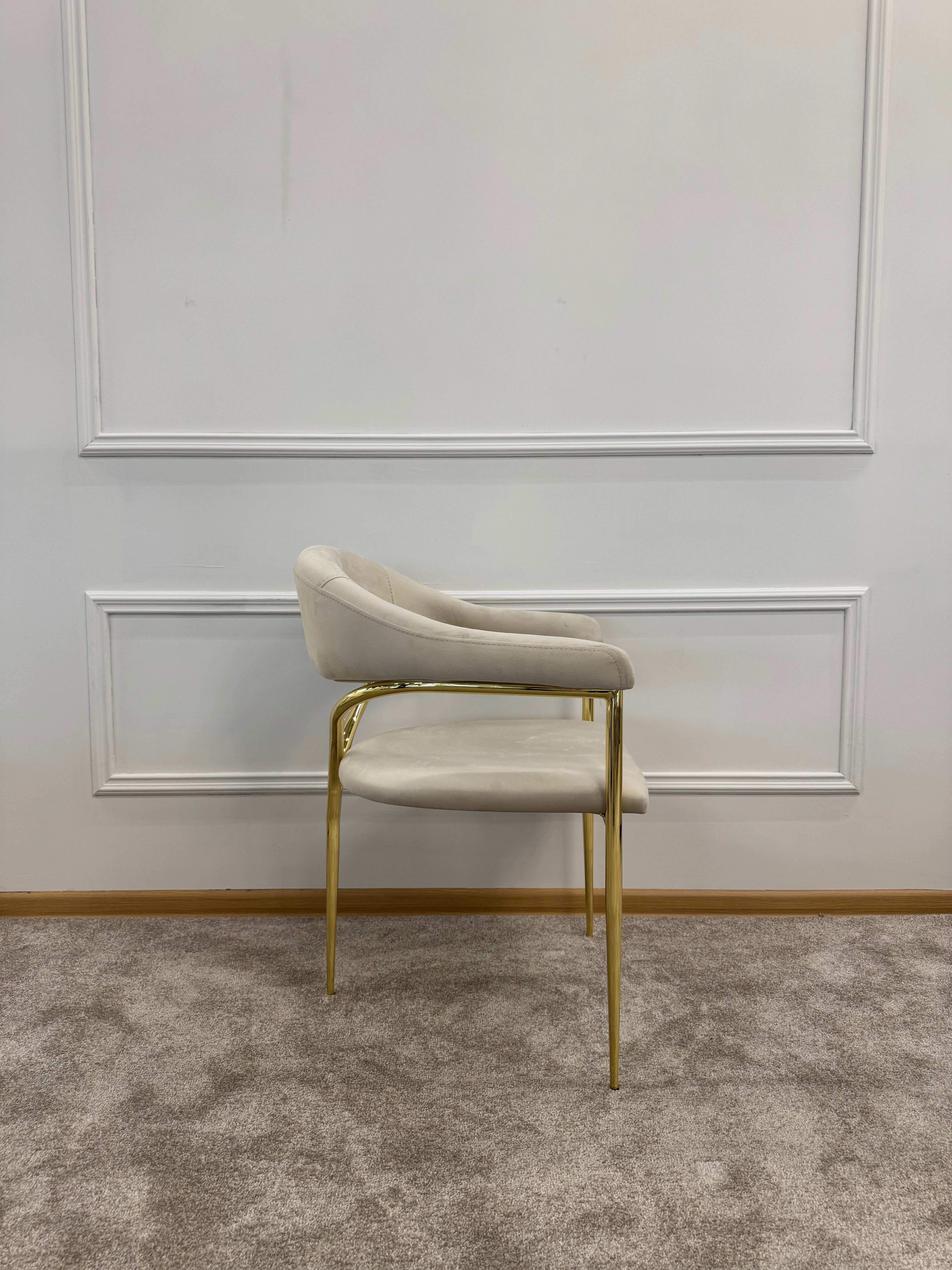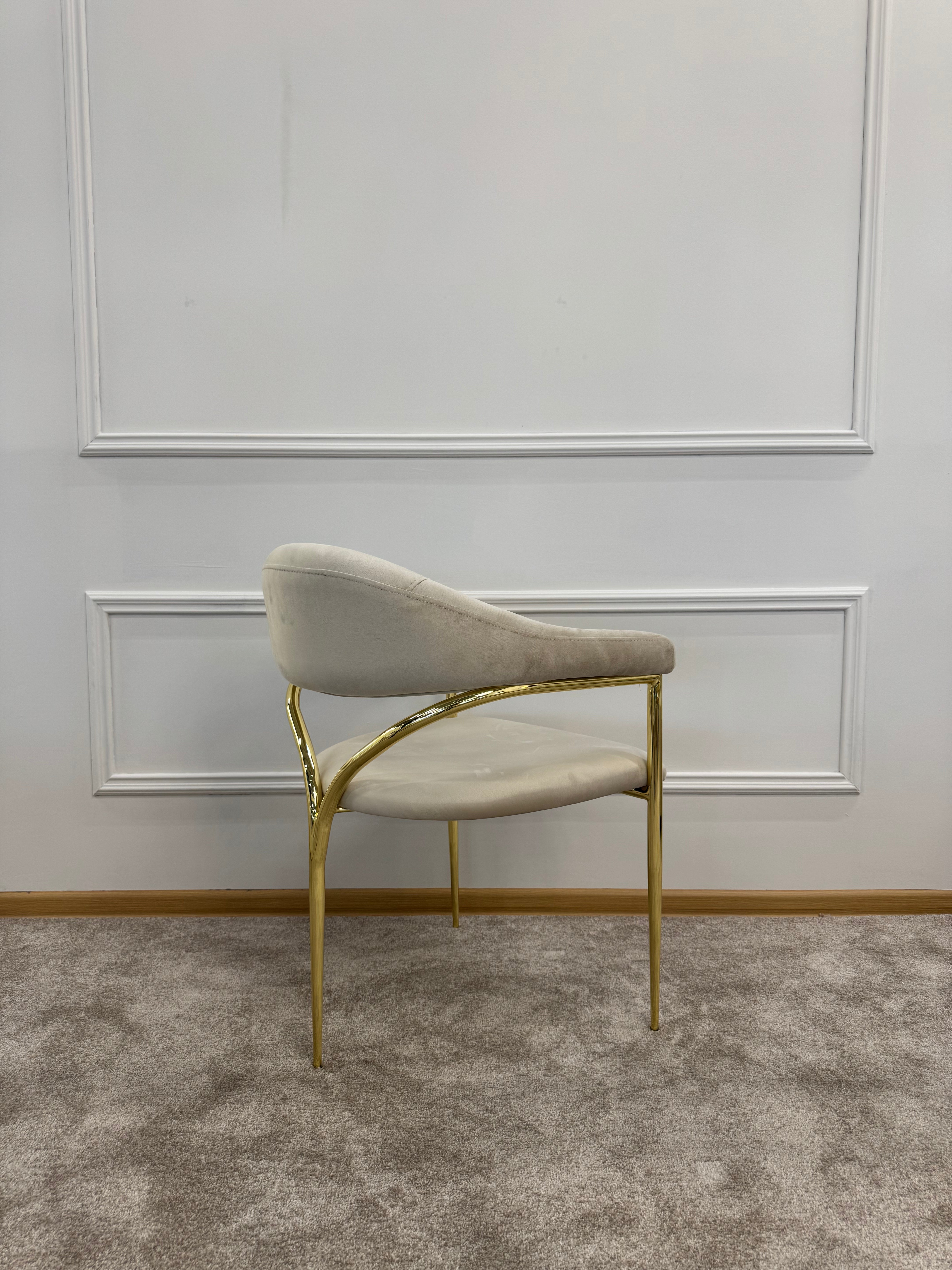 Стілець Mina — це витонченість у кожній лінії. Модель поєднує сучасний дизайн із легкими нотками гламурного стилю. Металевий каркас із золотистим блиском надає виробу розкішного вигляду, а м’яка текстурна оббивка у світлому відтінку додає тепла та комфорту.