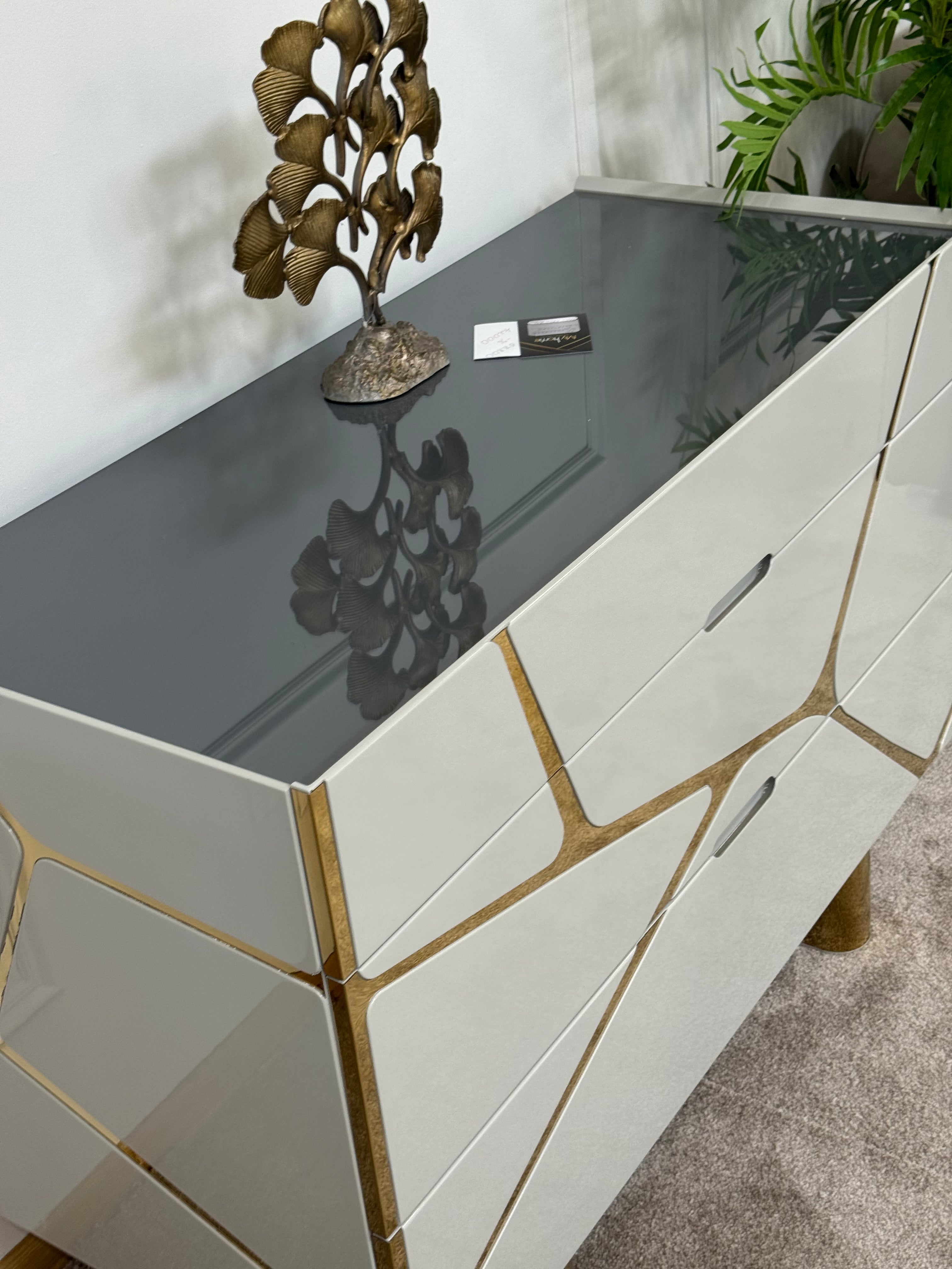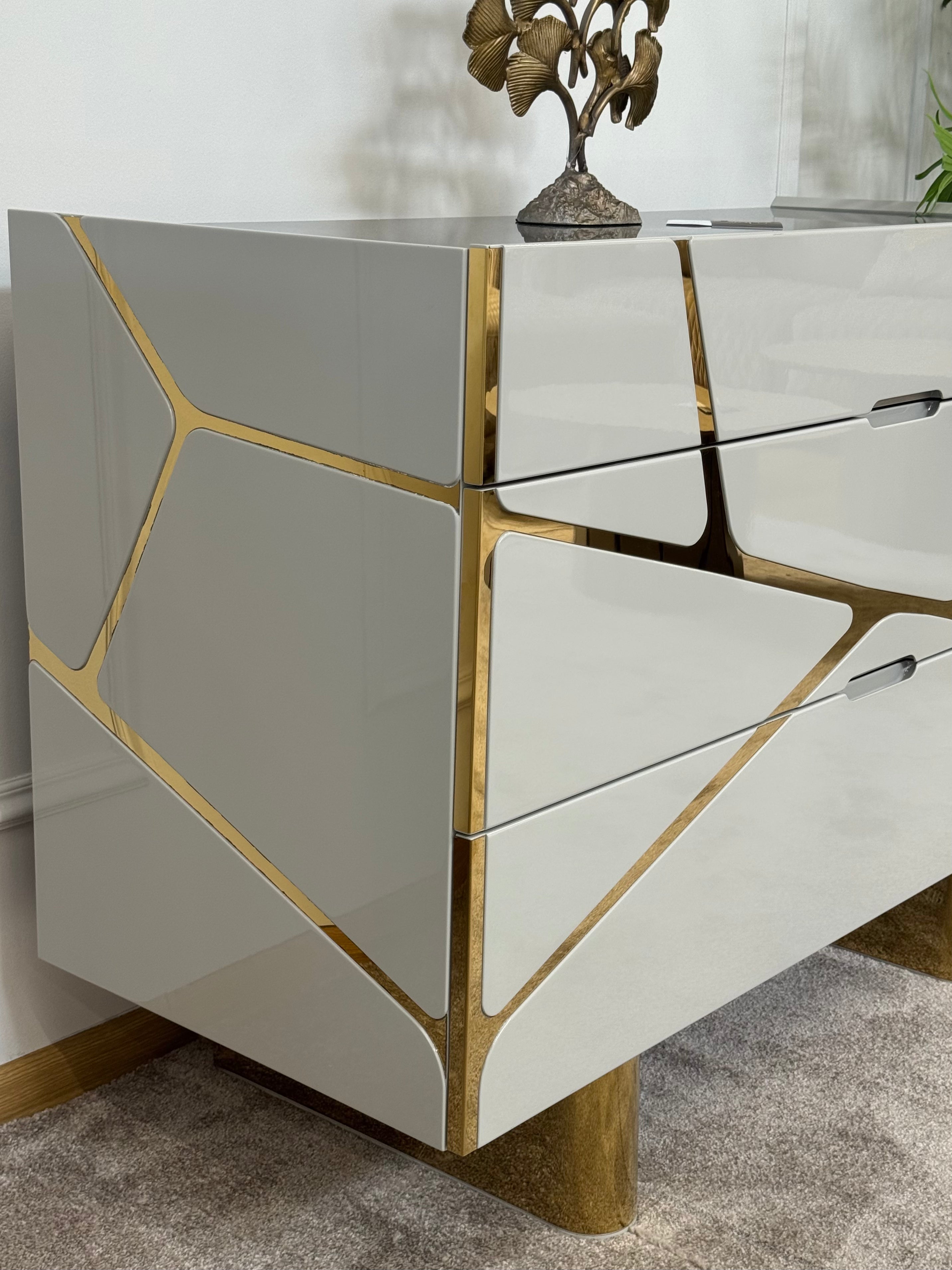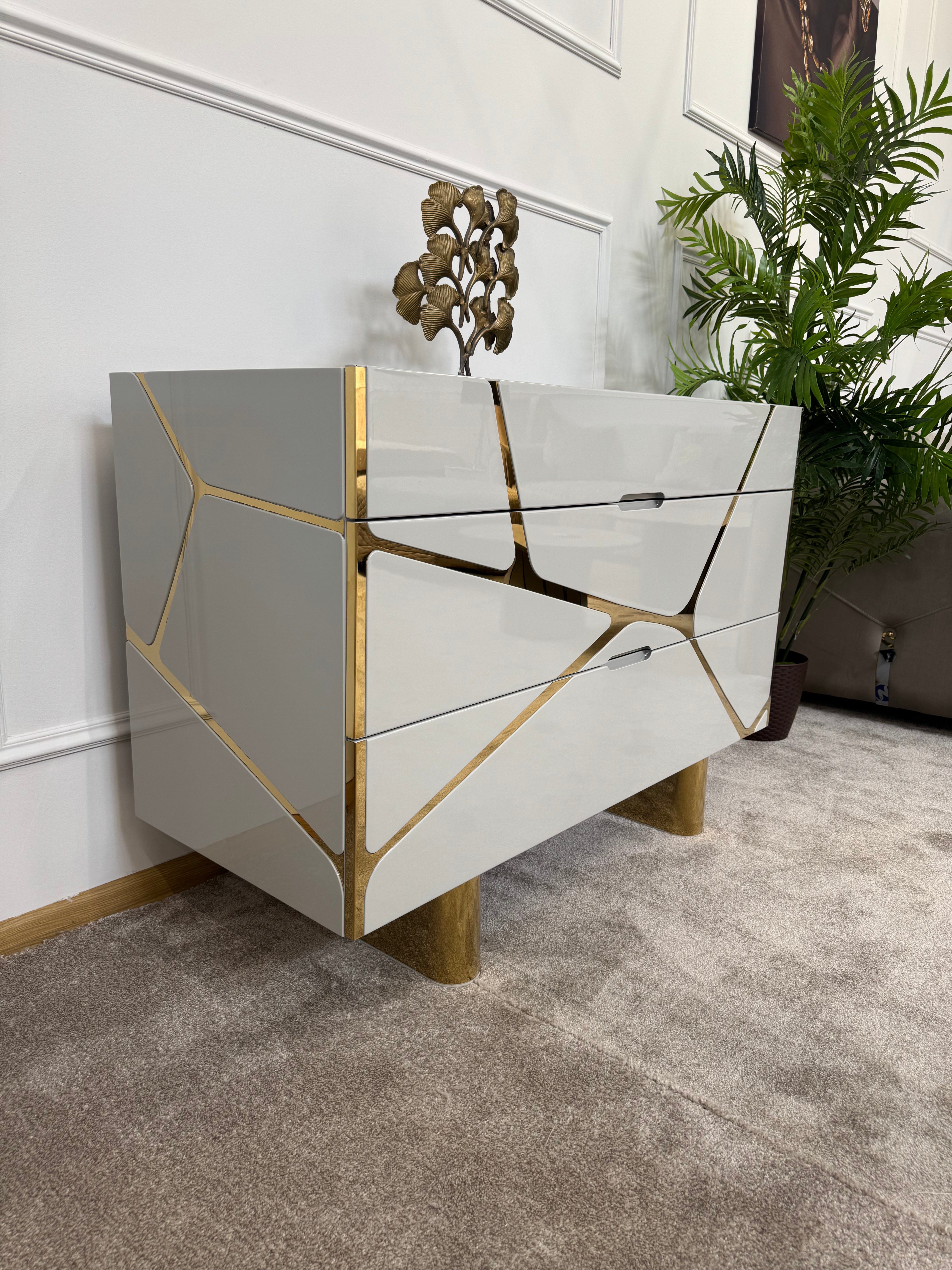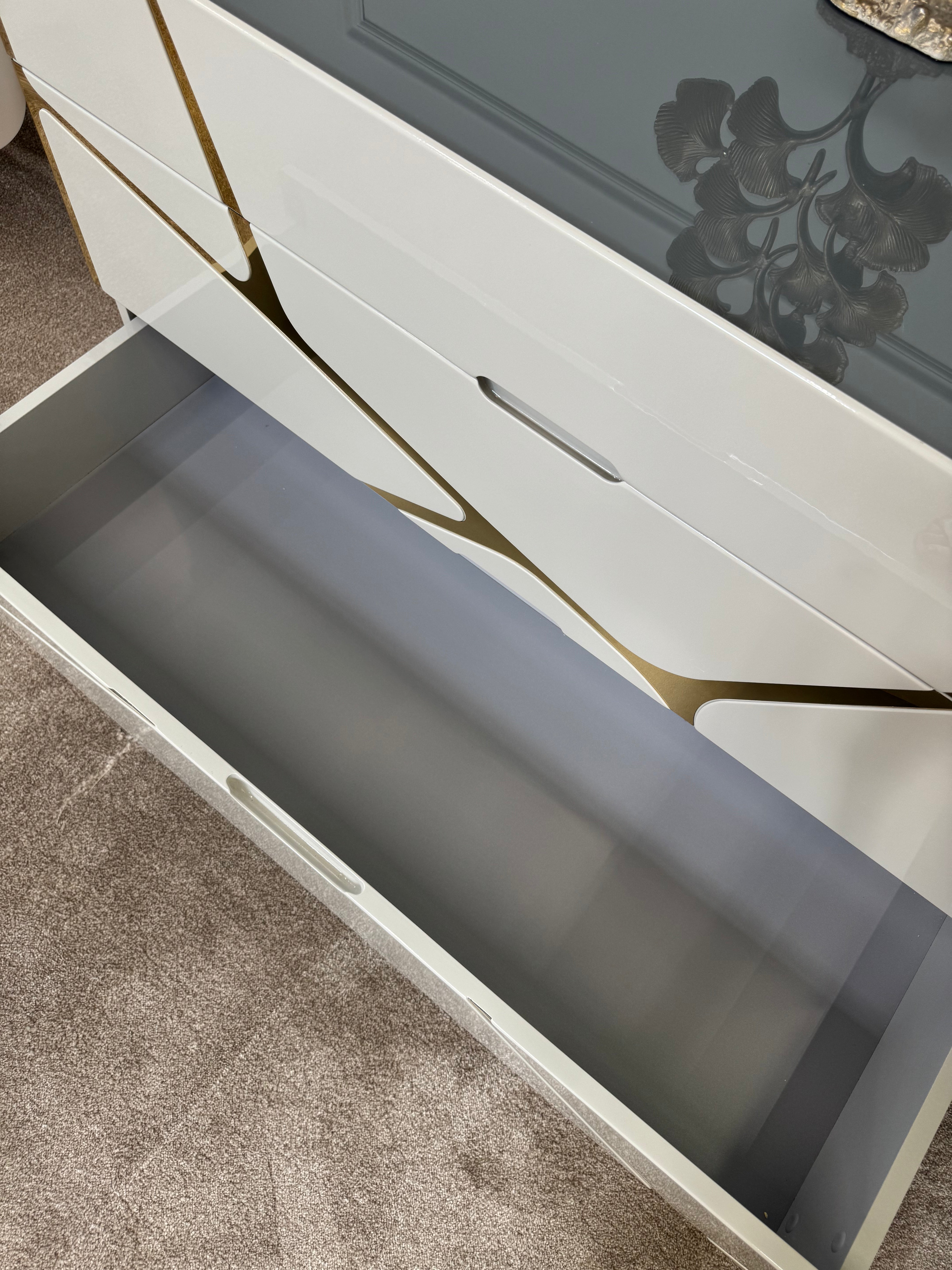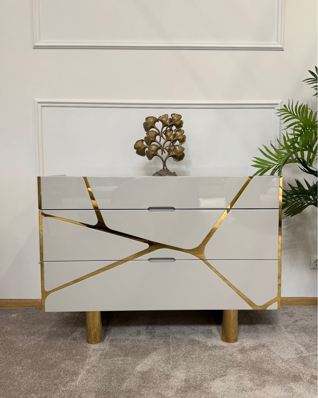 Модель має три місткі висувні шухляди, що забезпечують зручне та організоване зберігання. Золоті ніжки підкреслюють загальний стиль та роблять комод стійким і візуально легким.