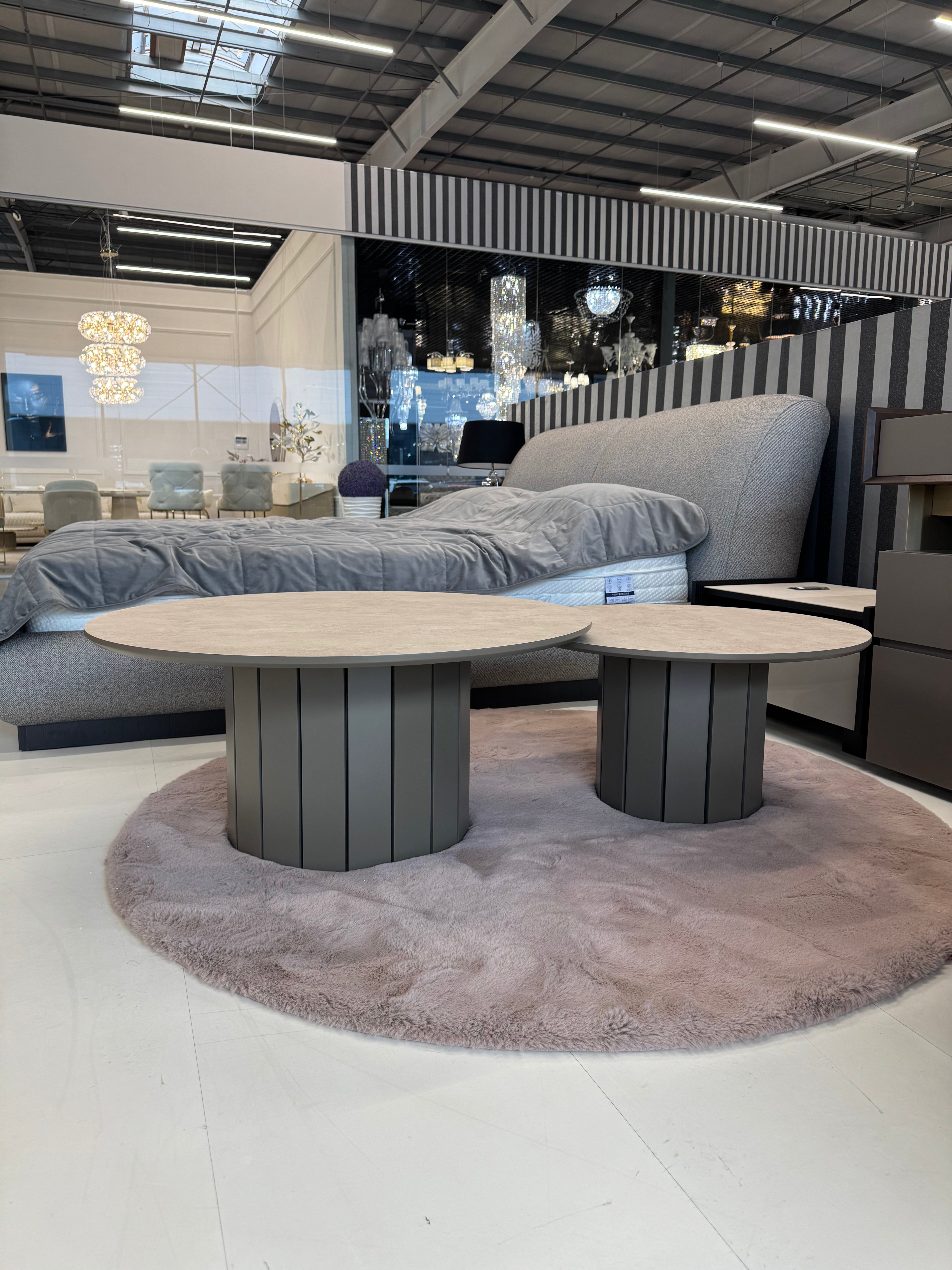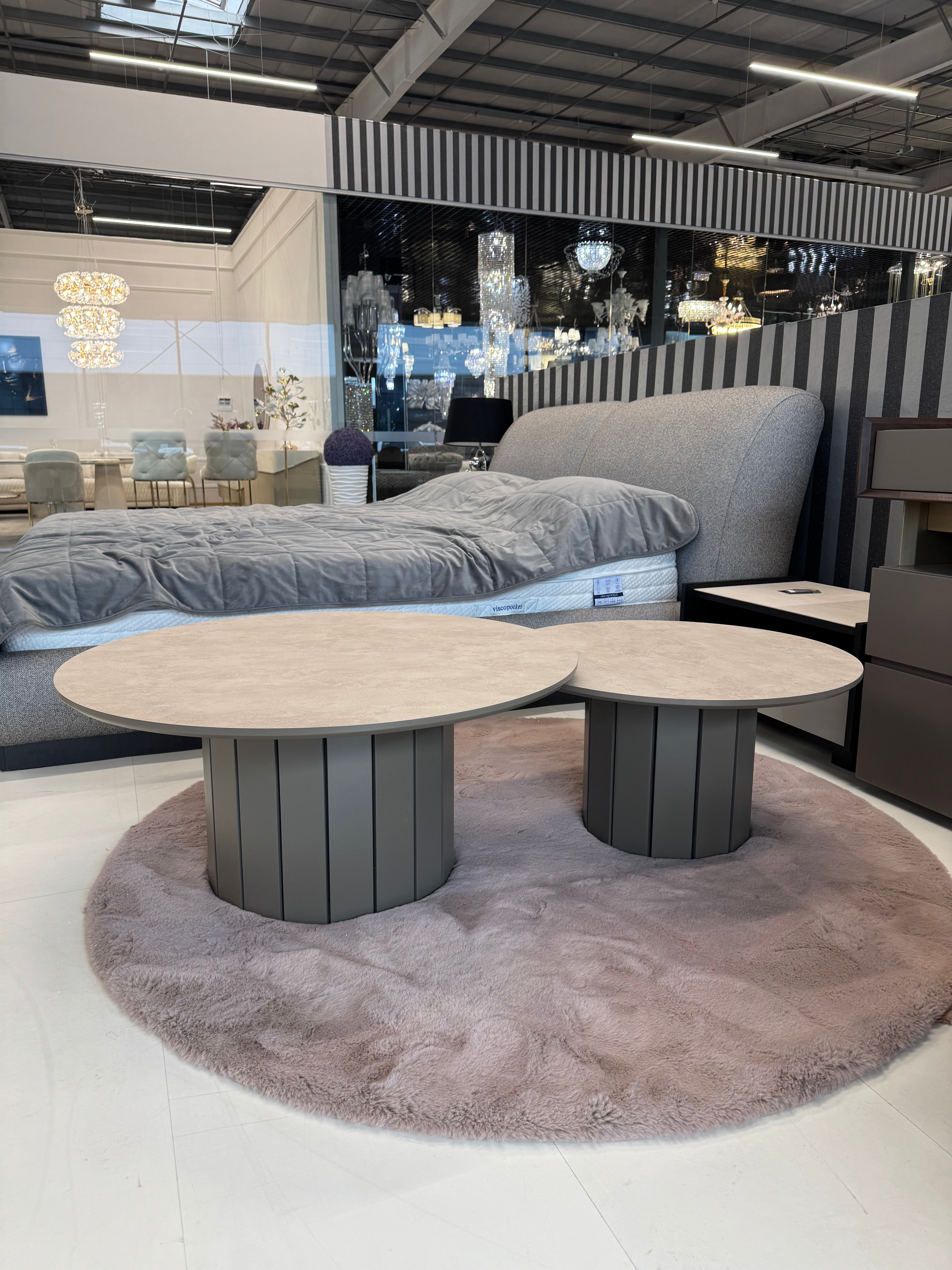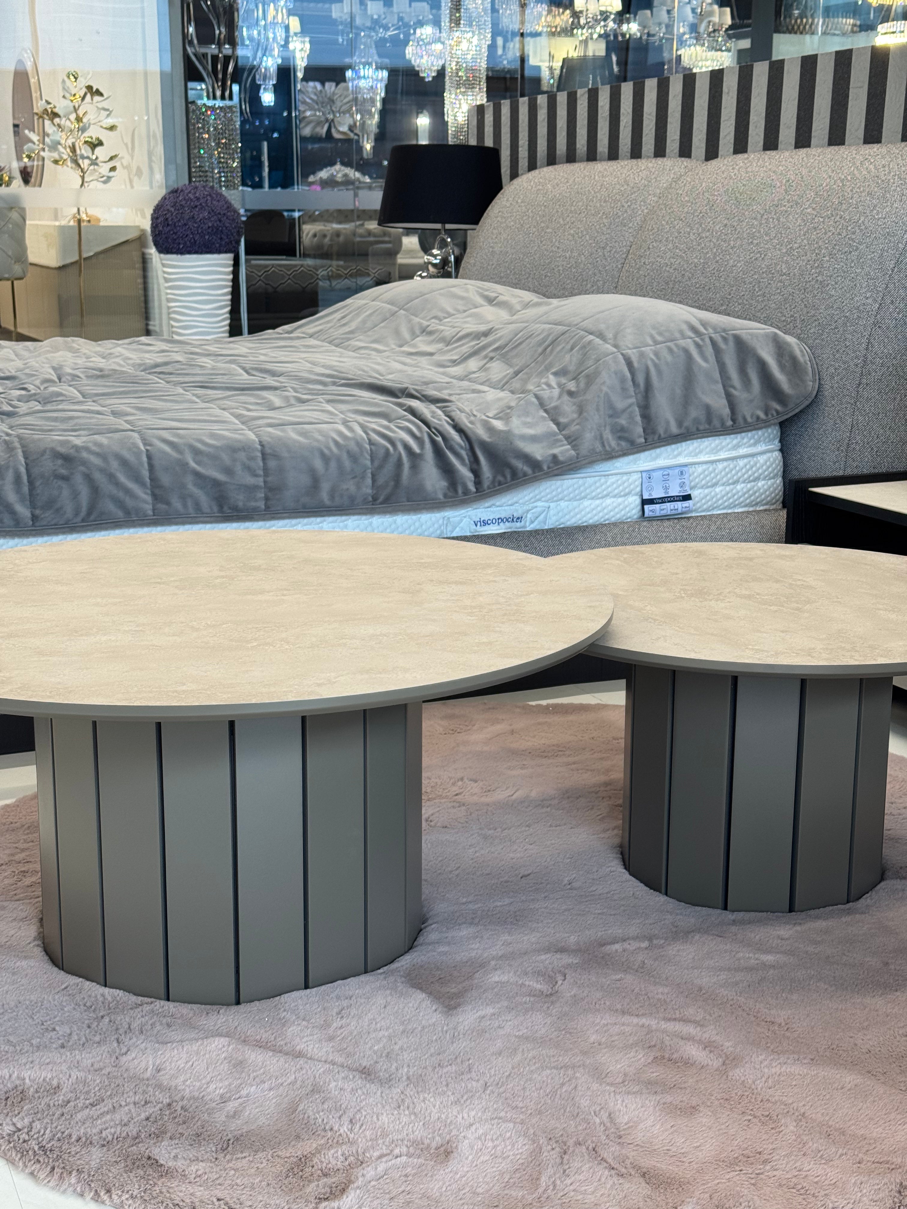 Круглі стільниці, виконані з матеріалу з фактурою каменю, виглядають стильно й водночас витримано. Основа столиків має декоративні вертикальні вставки, що додають об’ємності й елегантності. Ідеально підходять як для вітальні, так і для зони відпочинку в спальні.