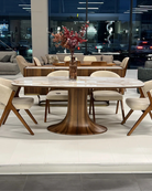 Стіл Browni 180 — це поєднання природної естетики та сучасного дизайну. Вишукана стільниця з ефектом мармуру створює відчуття розкоші, а дерев'яна основа додає тепла та гармонії простору. Овальна форма забезпечує зручність розміщення гостей, роблячи цей стіл ідеальним для сімейних обідів та затишних зустрічей. Browni 180 стане центральним елементом вашої обідньої зони, наповнюючи її елегантністю та комфортом.