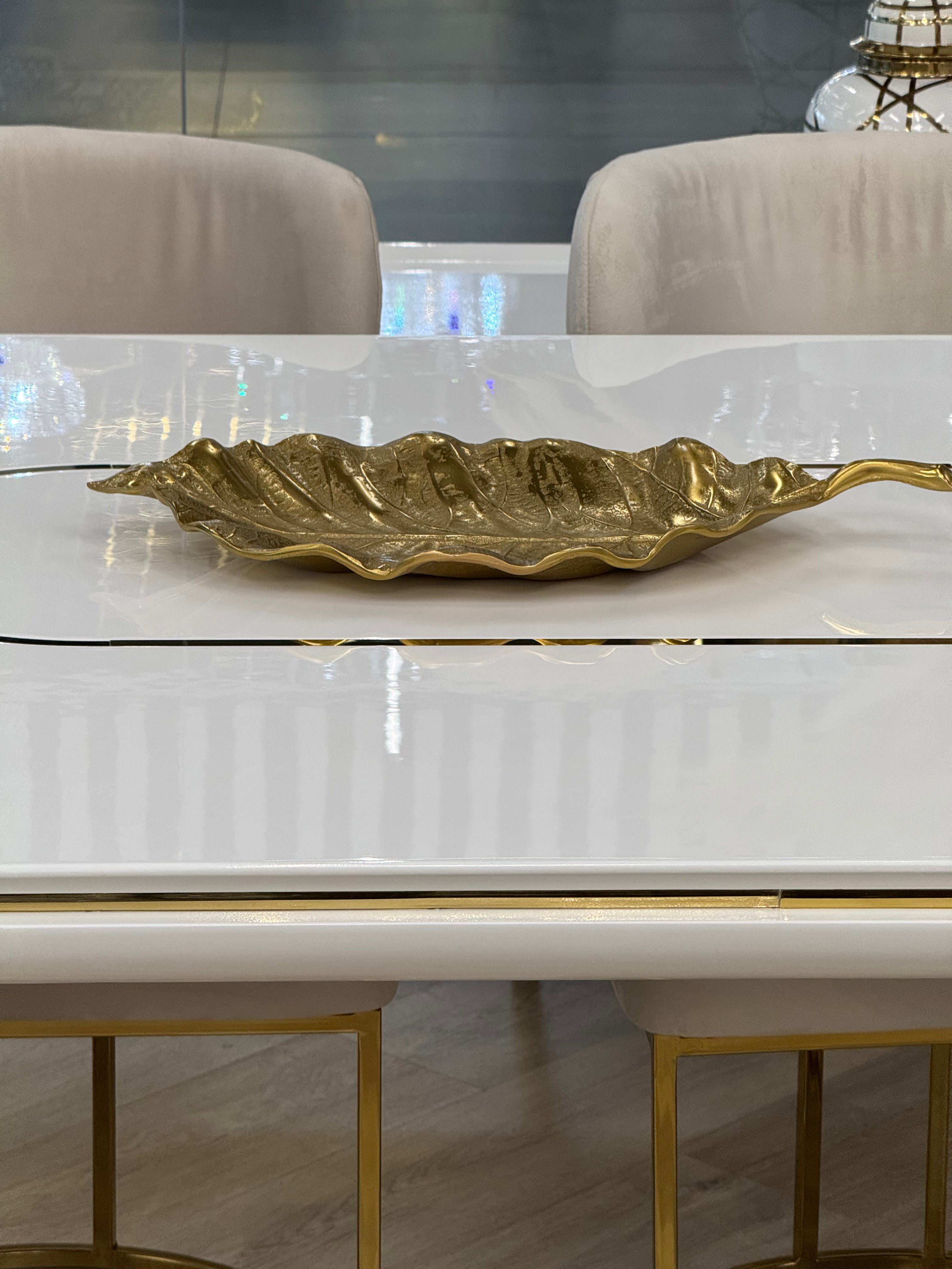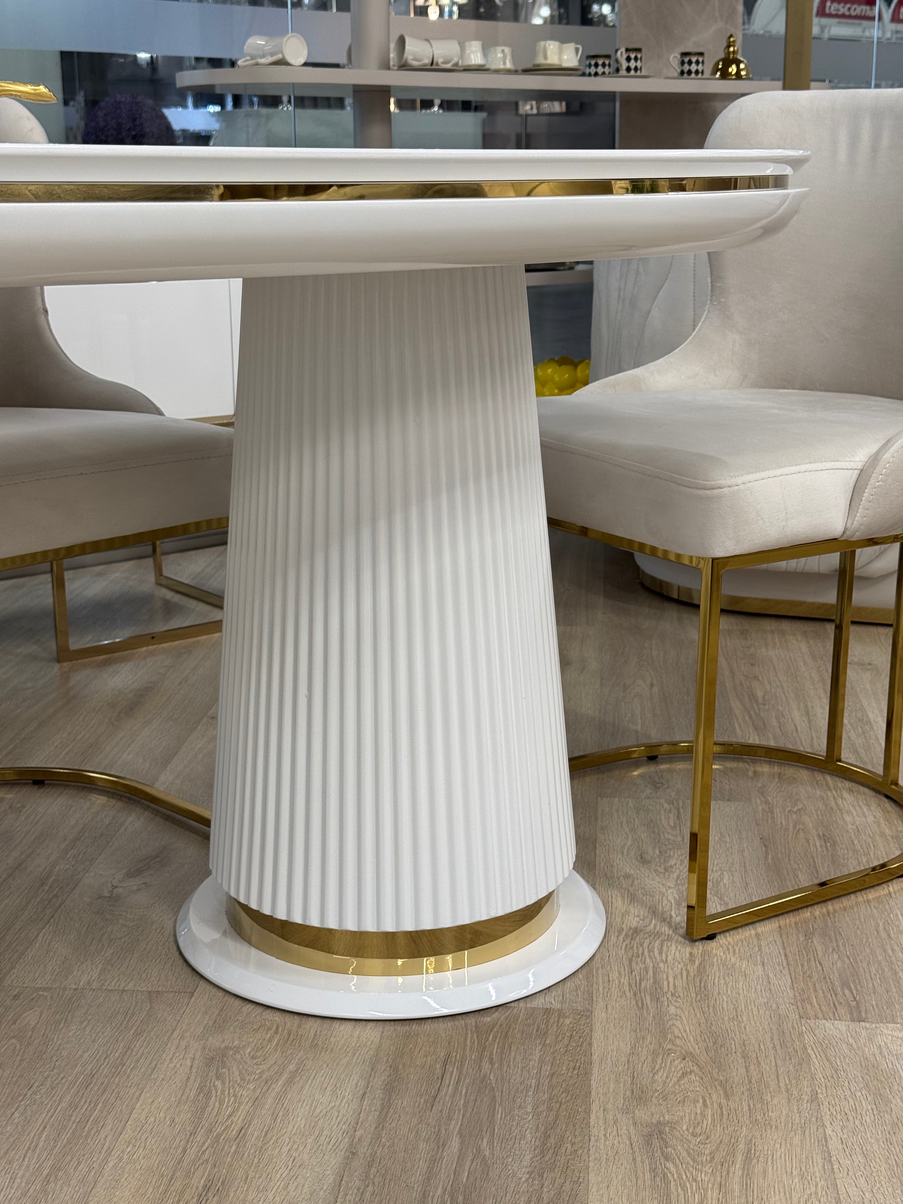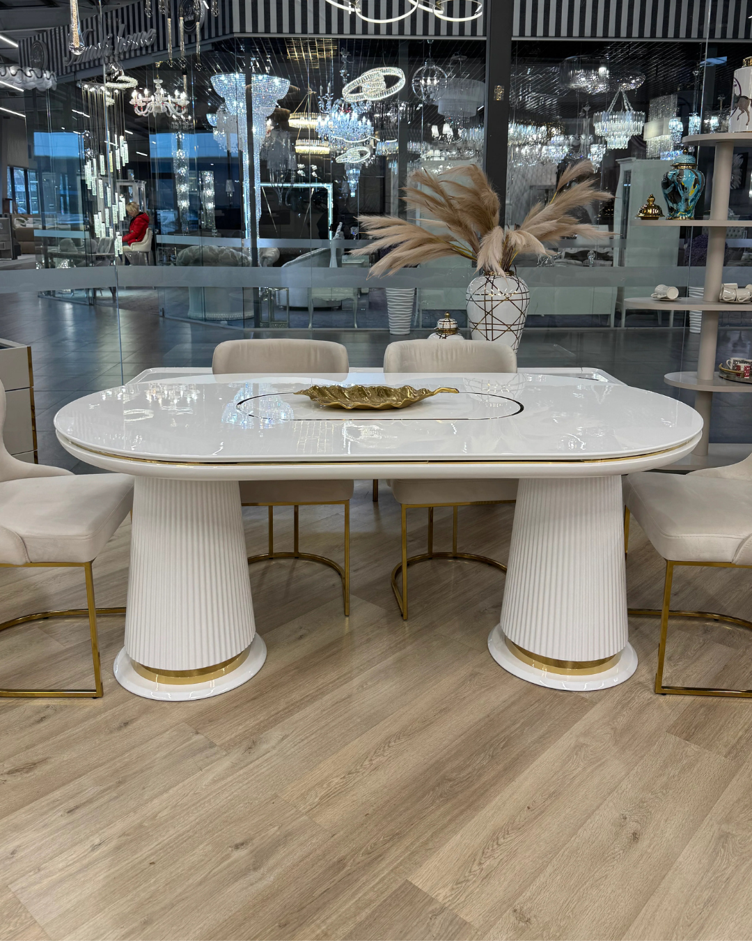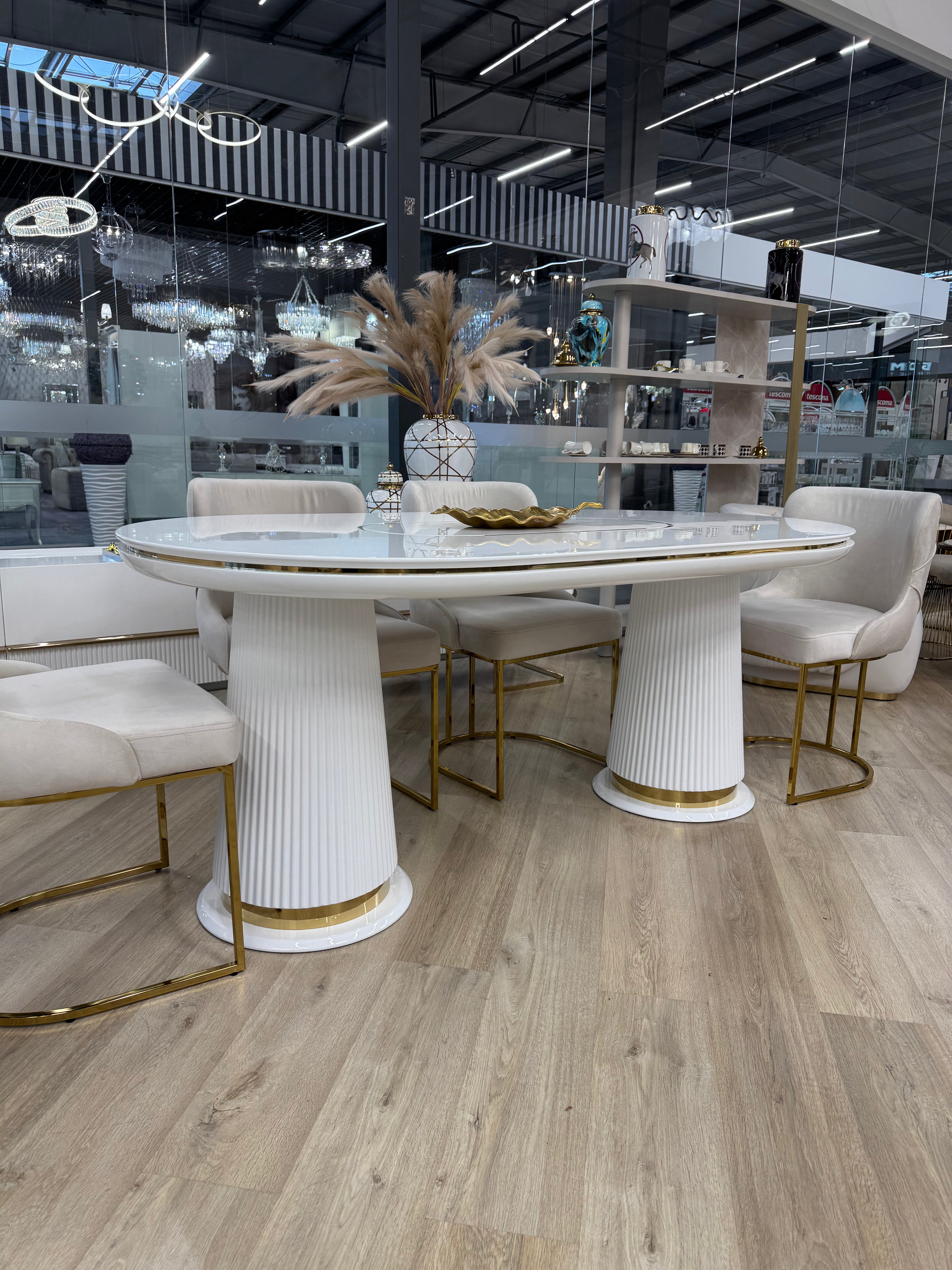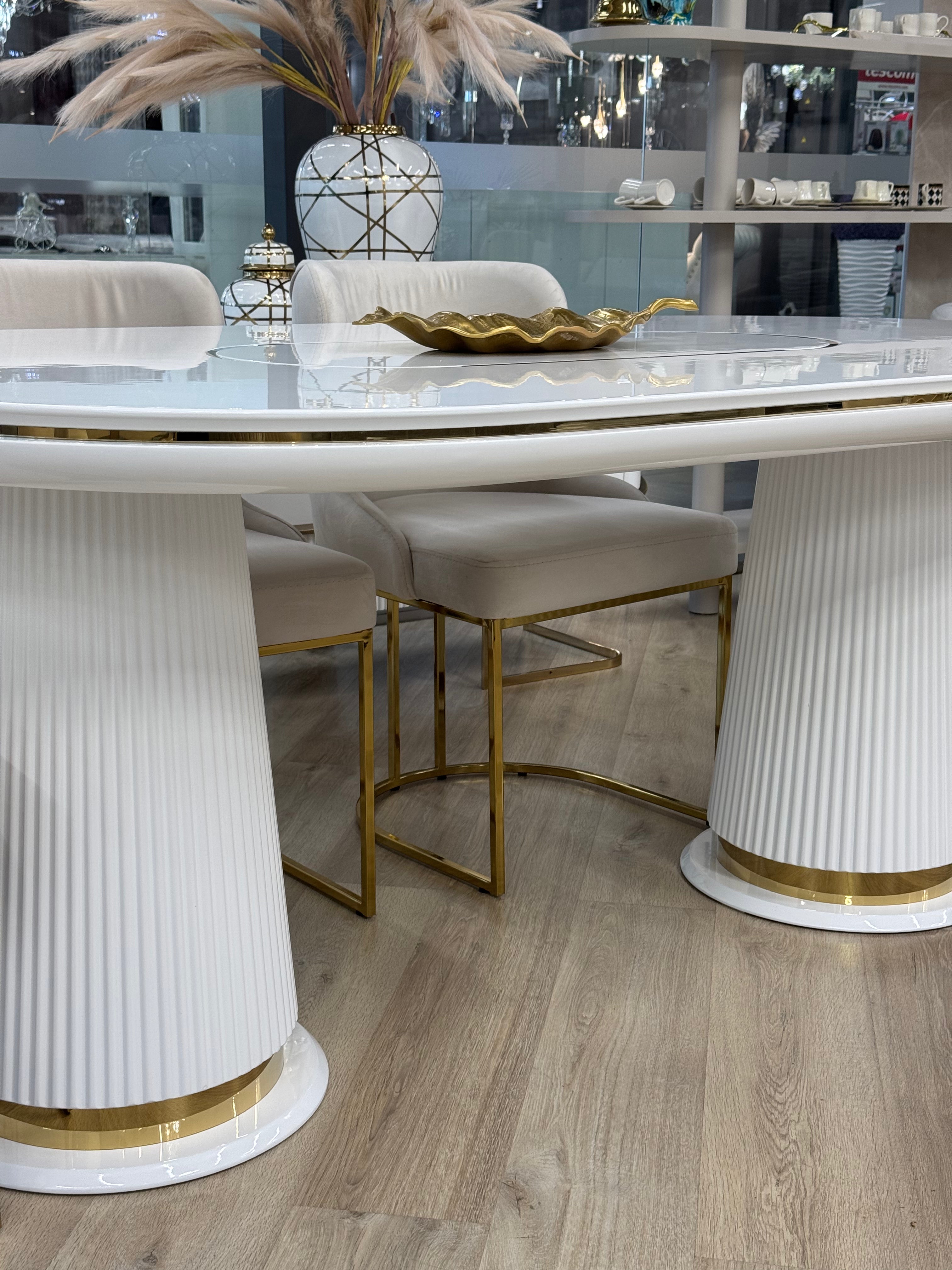 Стіл MUSTANG 180 — це втілення розкоші та елегантності. Білосніжна глянцева стільниця з декоративною вставкою по центру гармонійно поєднується з масивними рифленими опорами, декорованими золотом. Така модель стане справжньою окрасою будь-якої вітальні або їдальні, створюючи атмосферу вишуканості та комфорту. Ідеально підходить для просторих приміщень і урочистих подій.