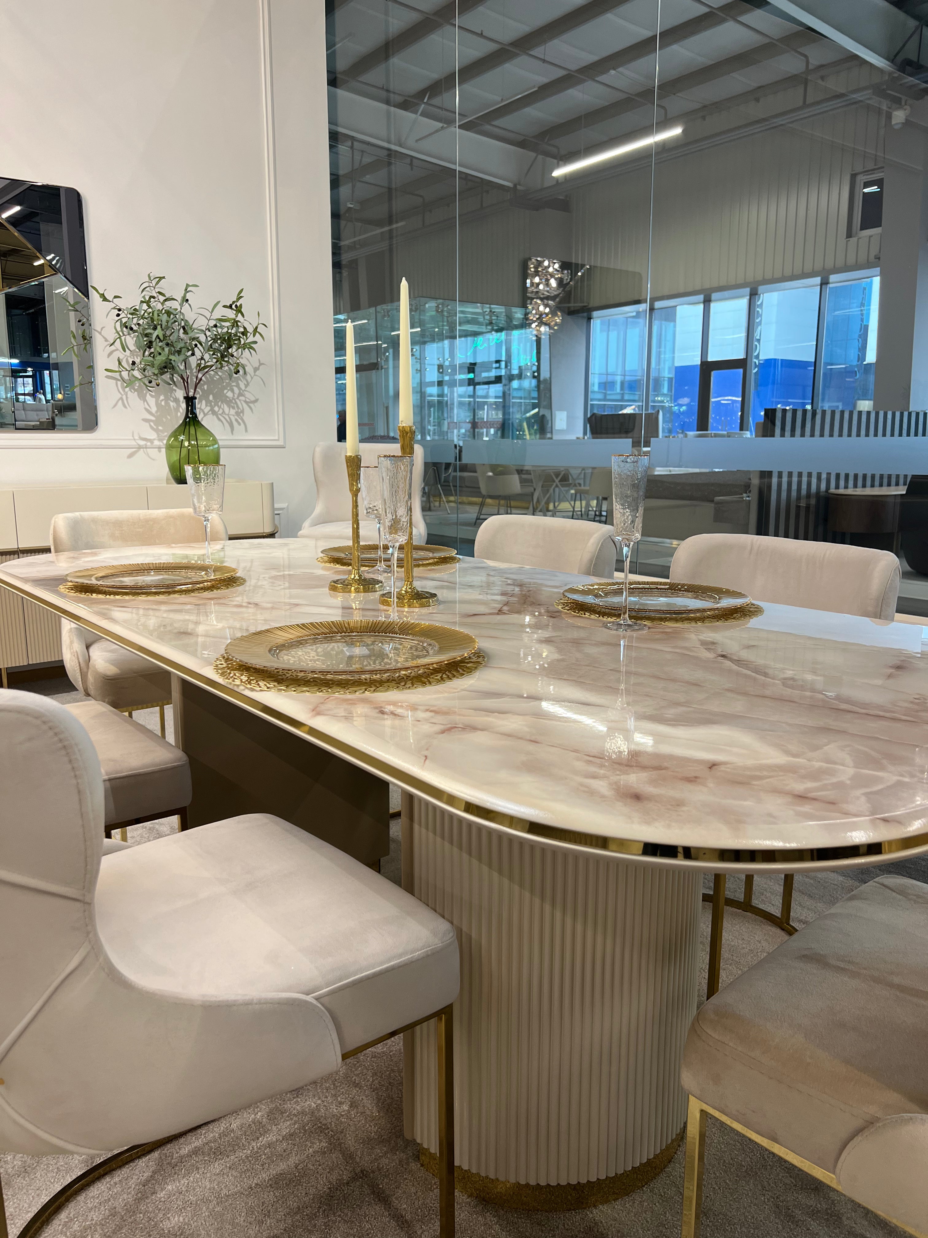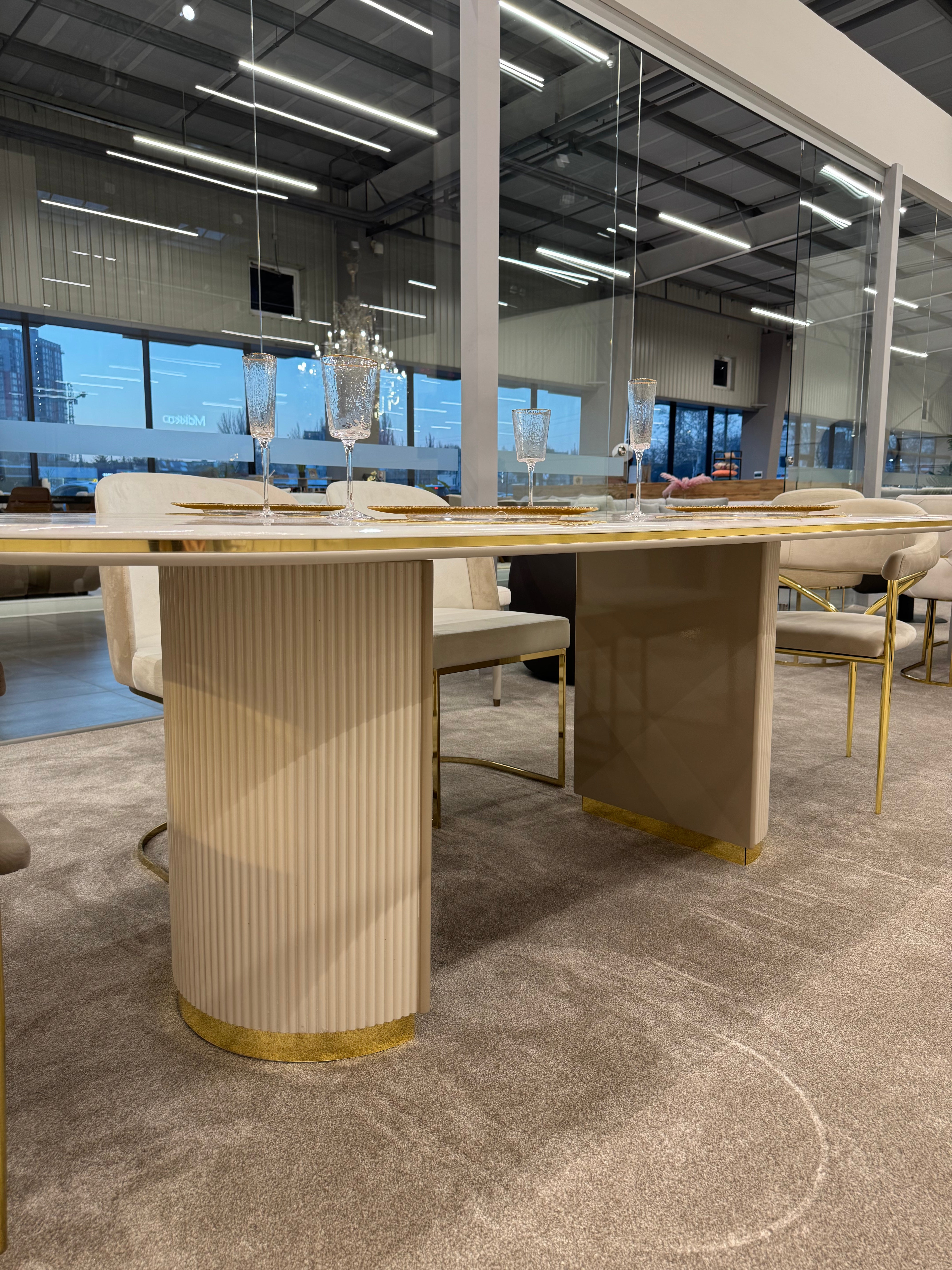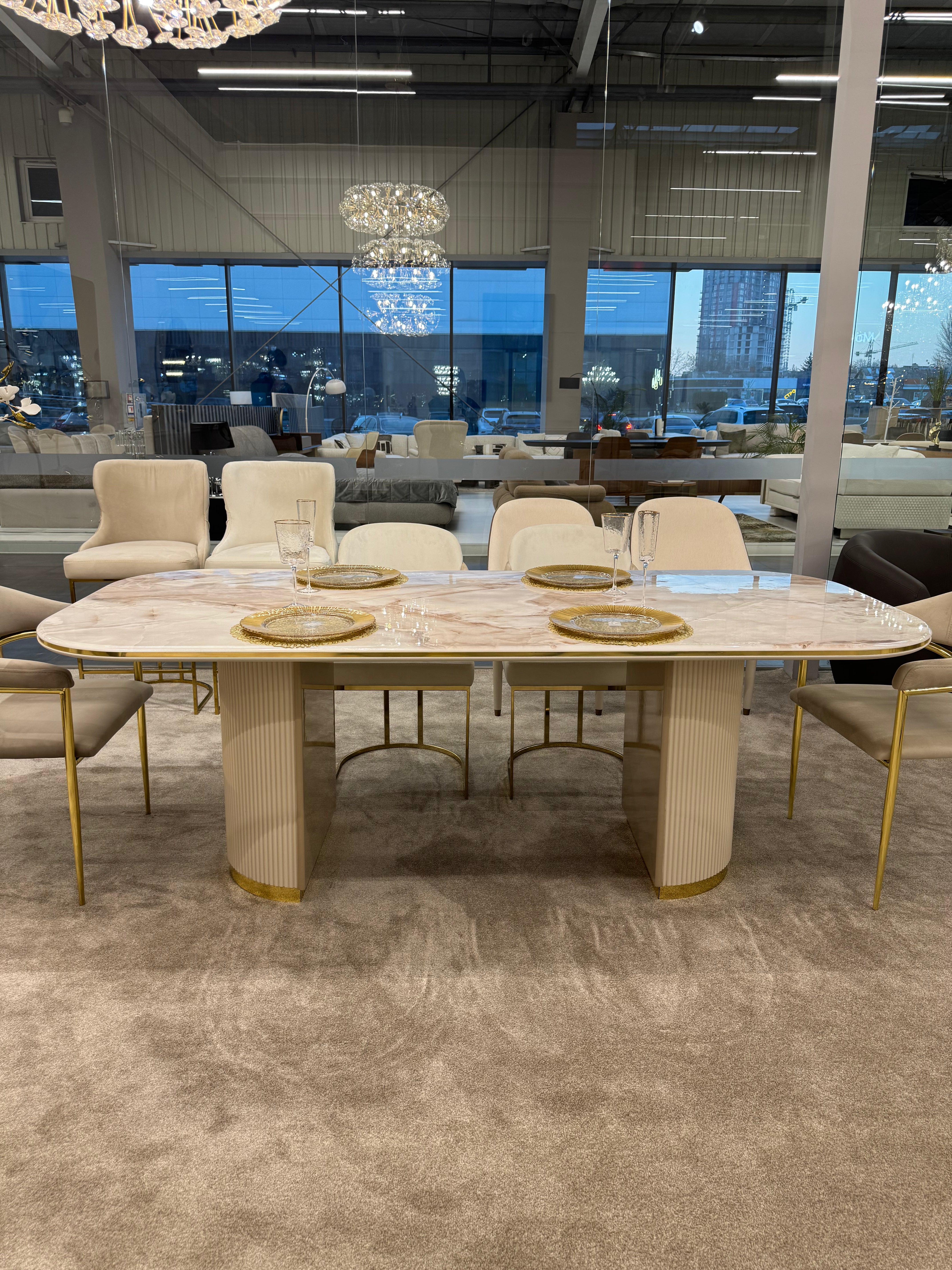Стіл OSCAR 220 – це елегантне рішення для вашої вітальні або їдальні. Його розкішний дизайн із заокругленими краями, мармуровою стільницею та золотистими акцентами створює атмосферу витонченості та статусності.