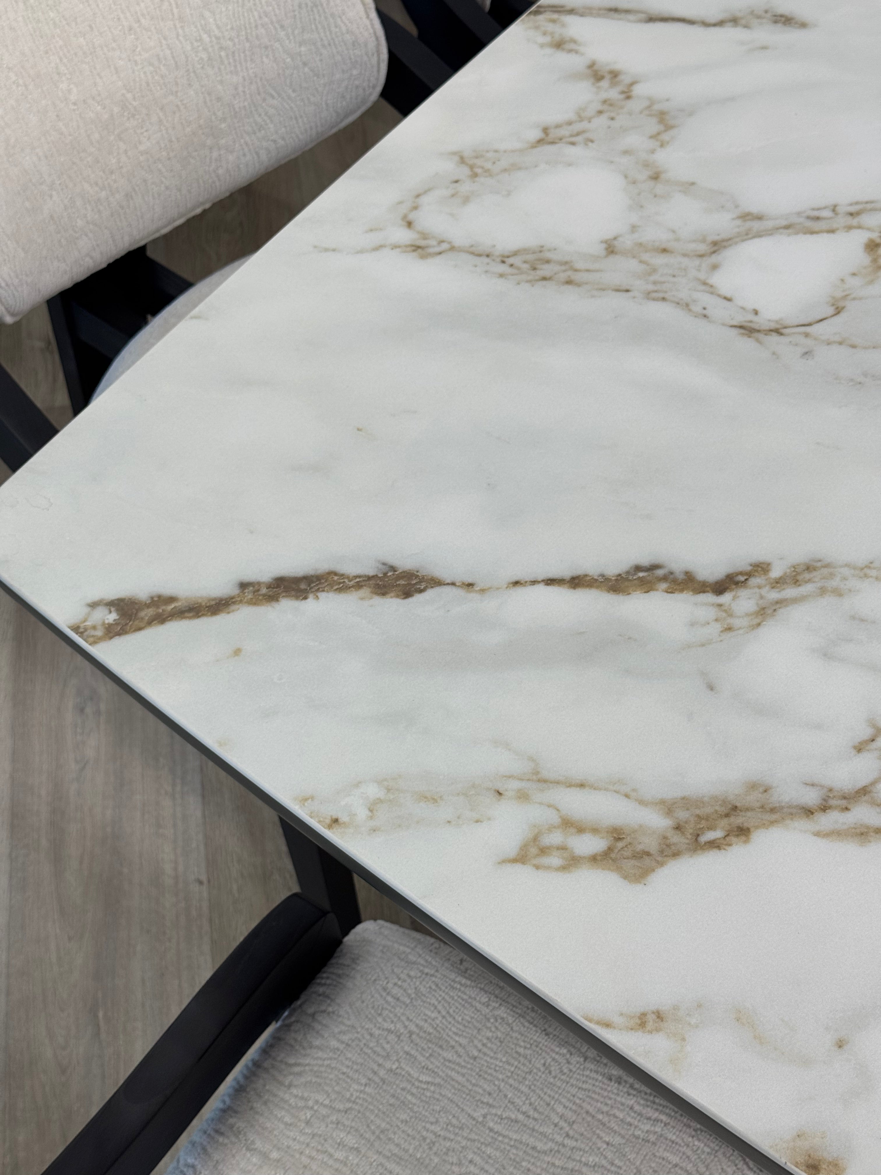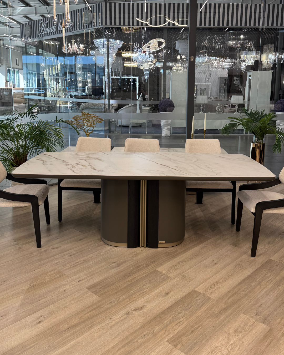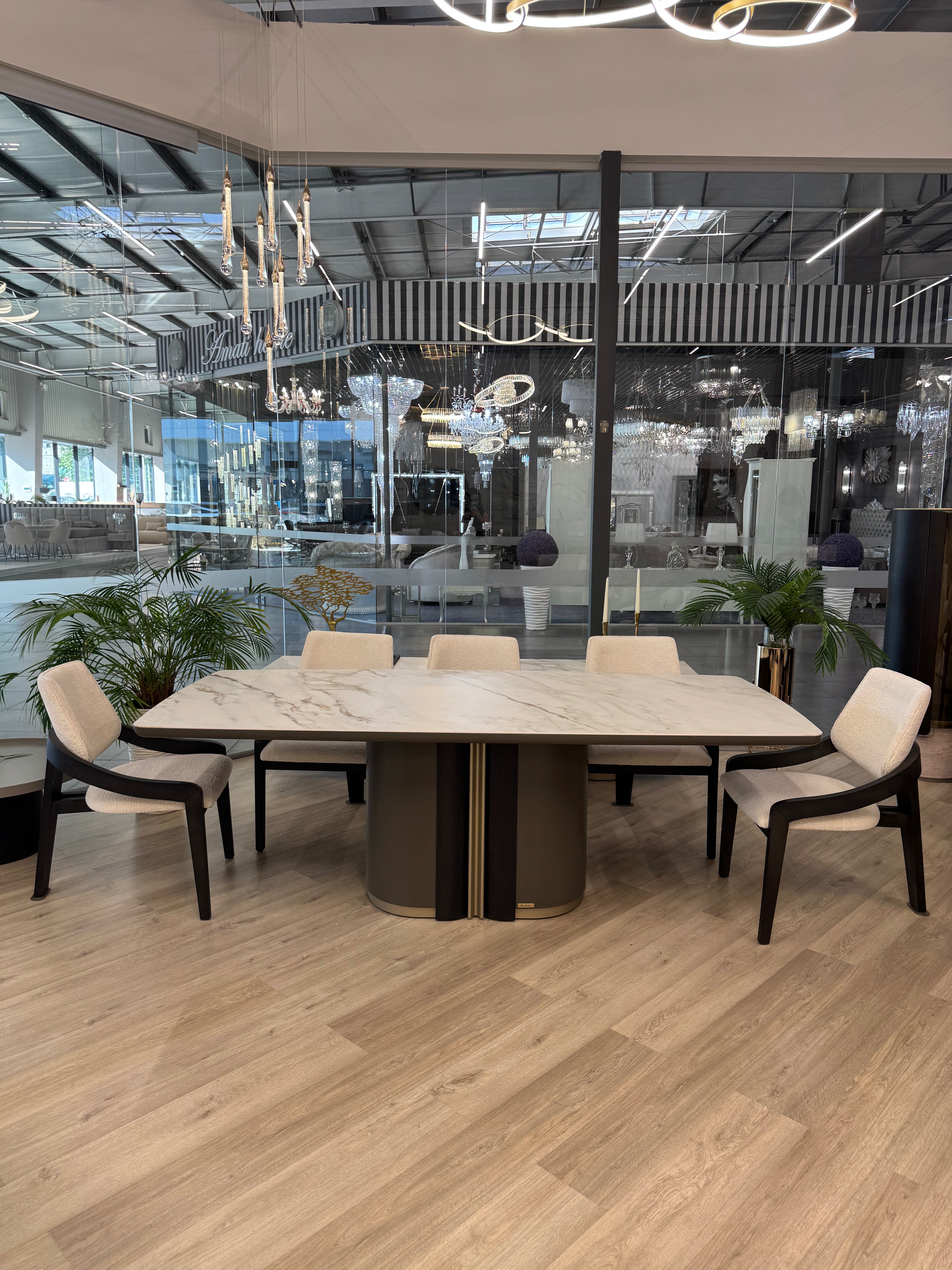 Поєднання витонченого дизайну, розкішної стільниці з ефектом мармуру та масивної бази робить Pierre Cardin справжнім центром уваги в інтер'єрі. Він створений, щоб вражати з першого погляду та дарувати комфорт під час кожної трапези.