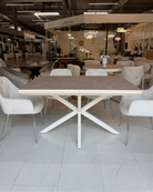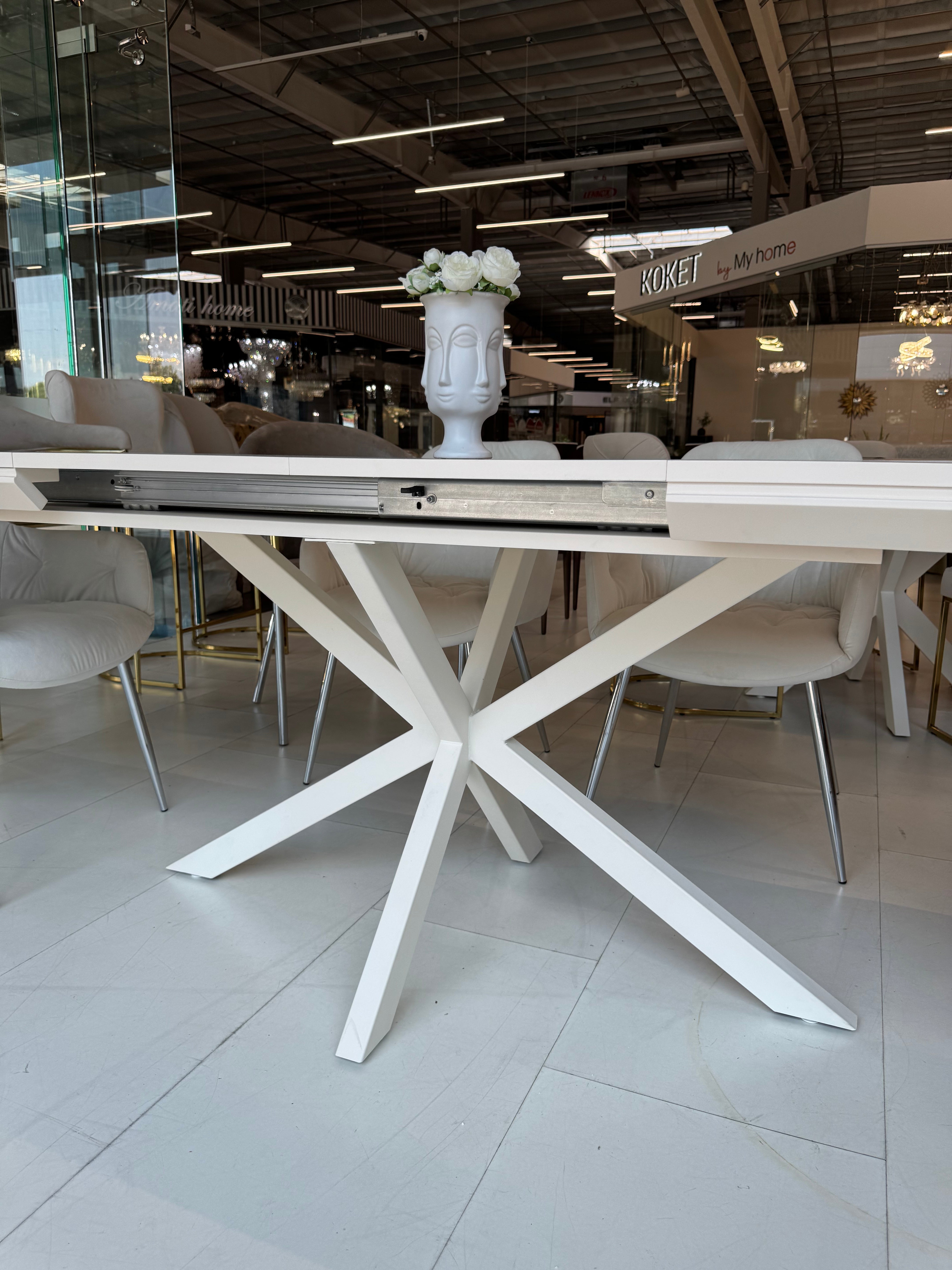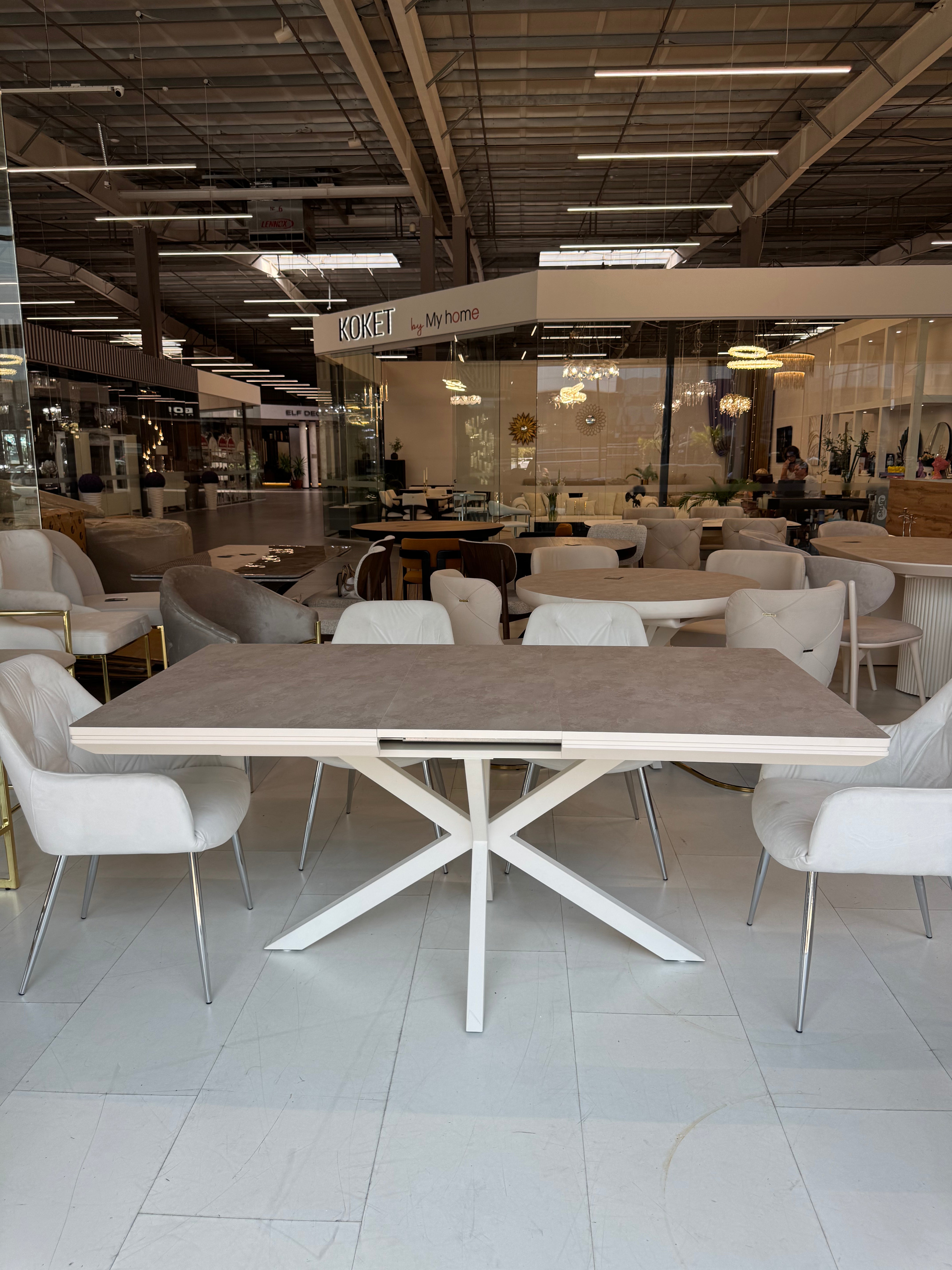 Цей розкладний стіл поєднує сучасний дизайн і практичність, створюючи ідеальне місце для сімейних обідів та дружніх зустрічей. Його елегантна стільниця під камінь додає інтер’єру вишуканості, а міцна основа гарантує довговічність.