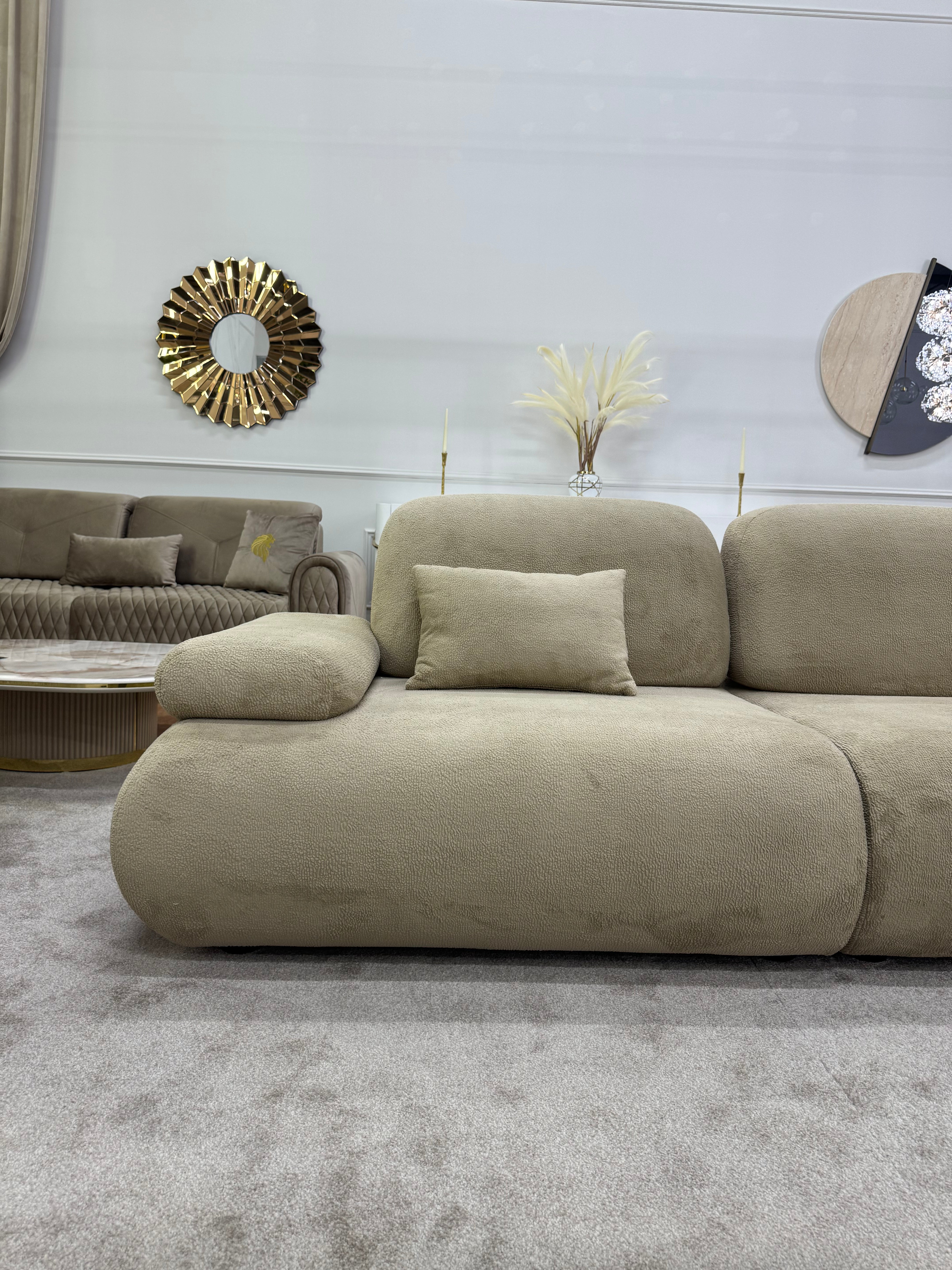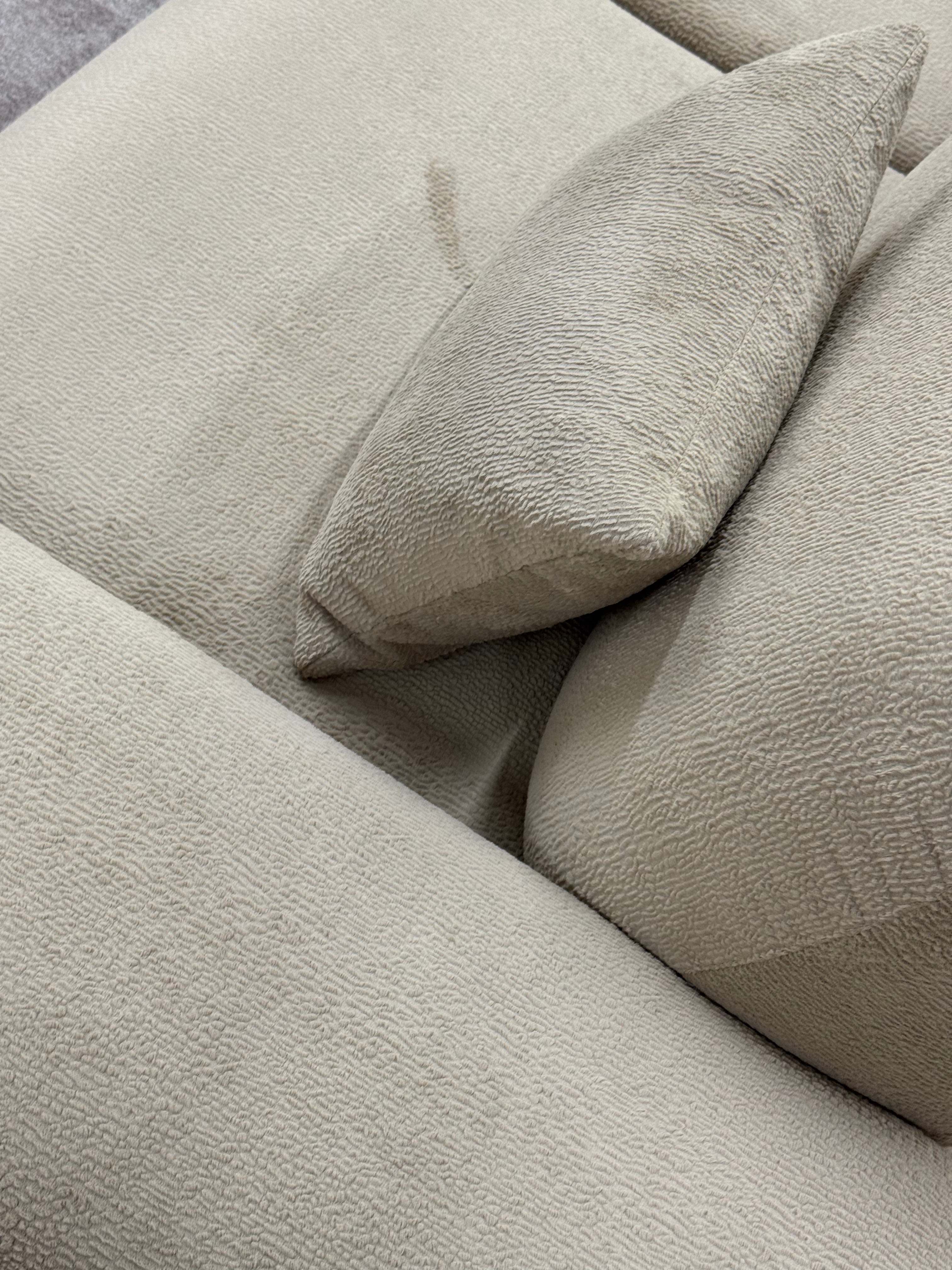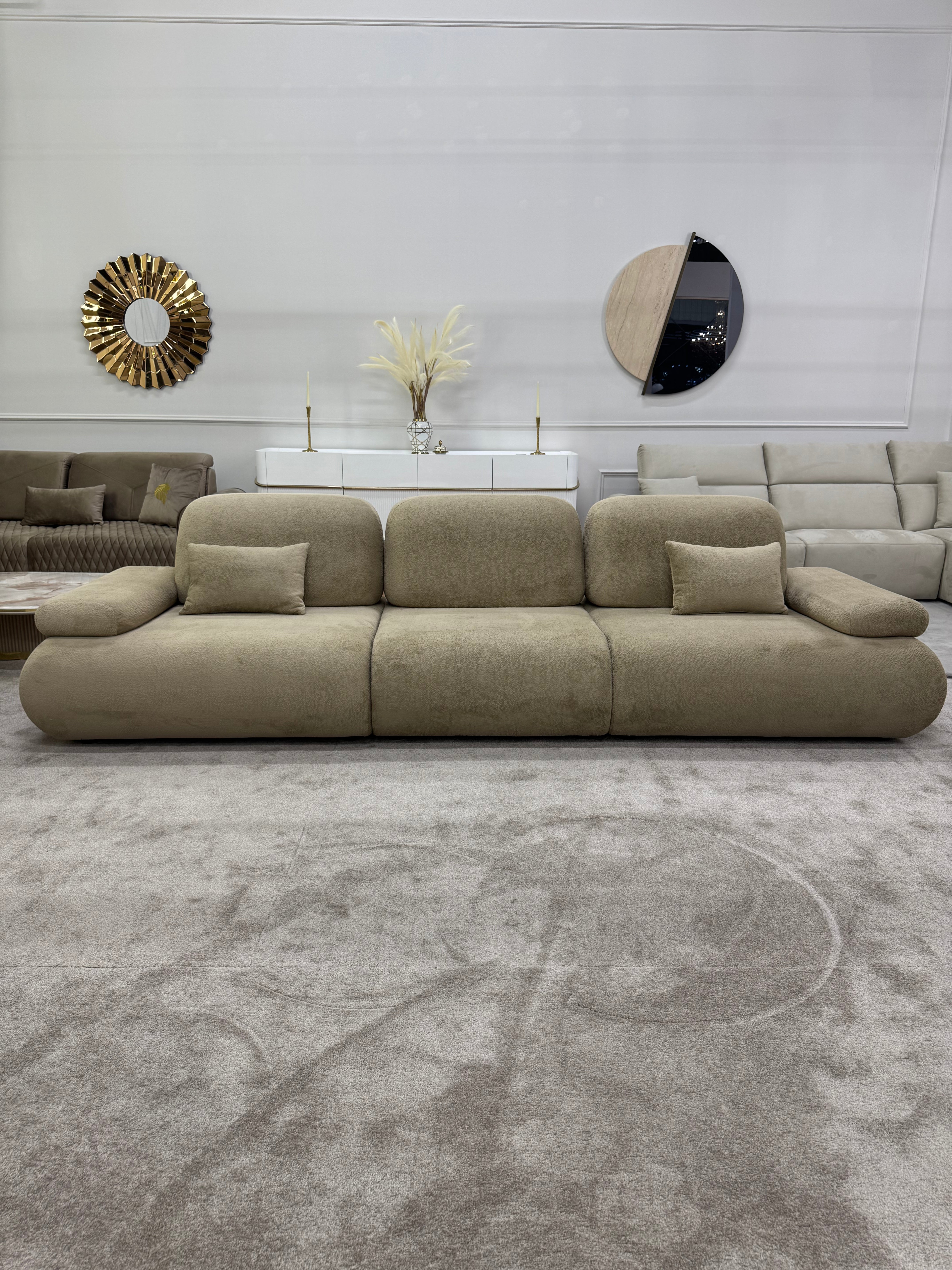 Стильний диван із плавними округлими формами та низькою посадкою. М'які об’ємні подушки створюють максимальний комфорт, а широка сидушка підходить для великої компанії або сімейного відпочинку. Оббивка приємна на дотик і легко доглядається.