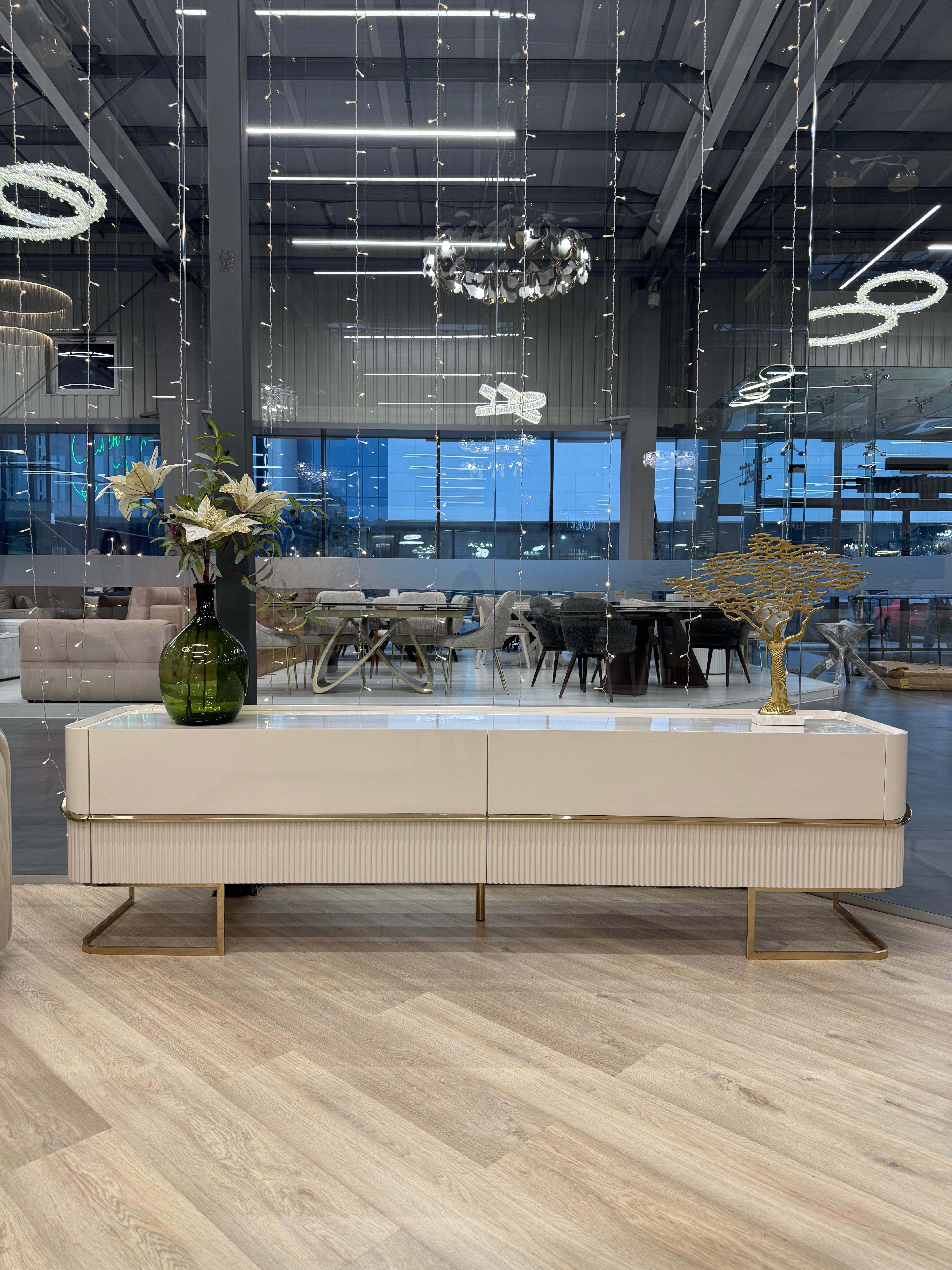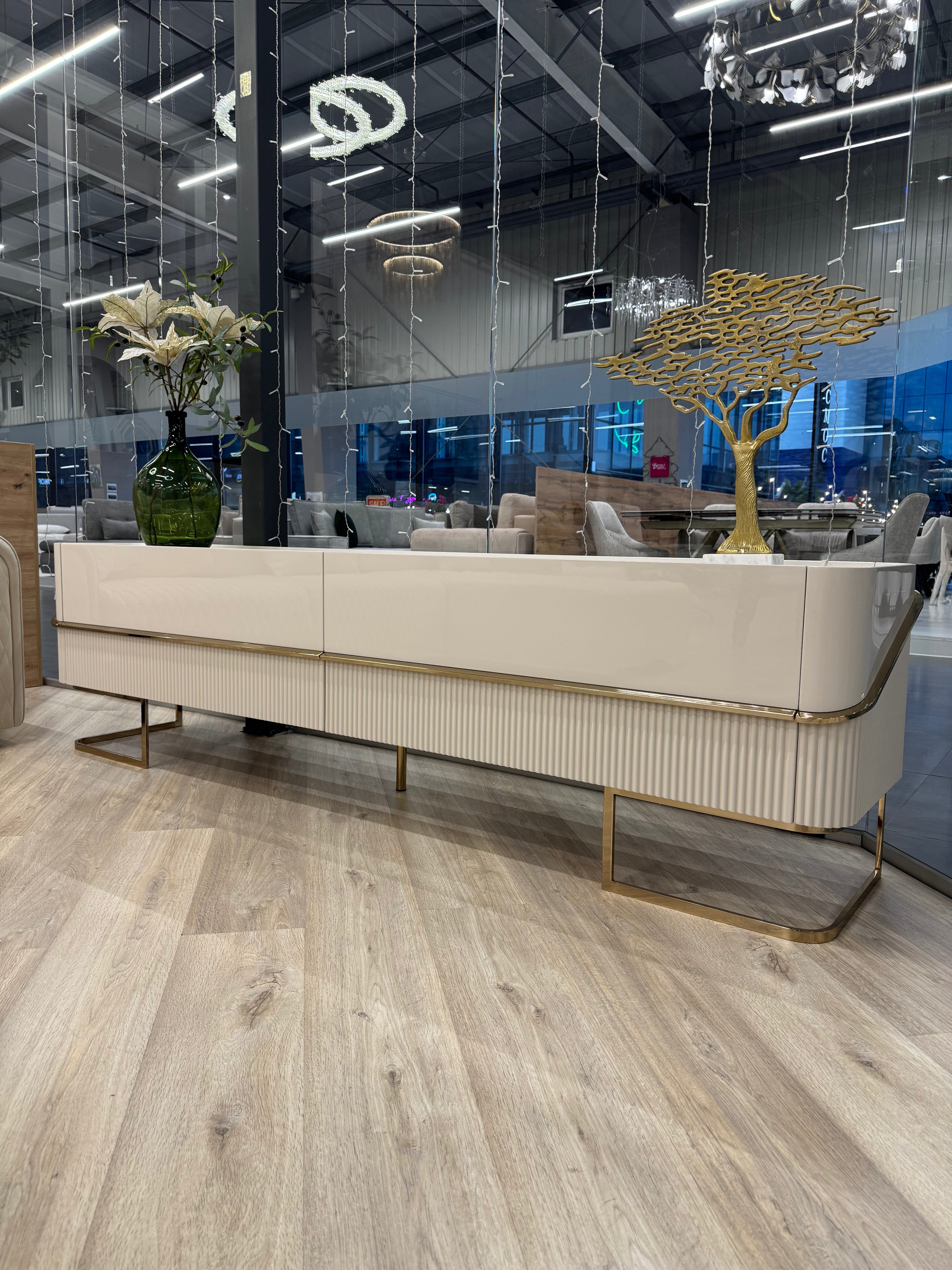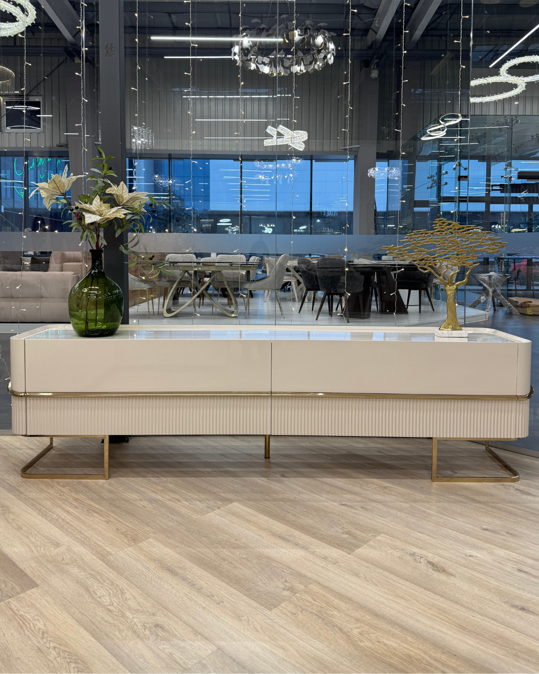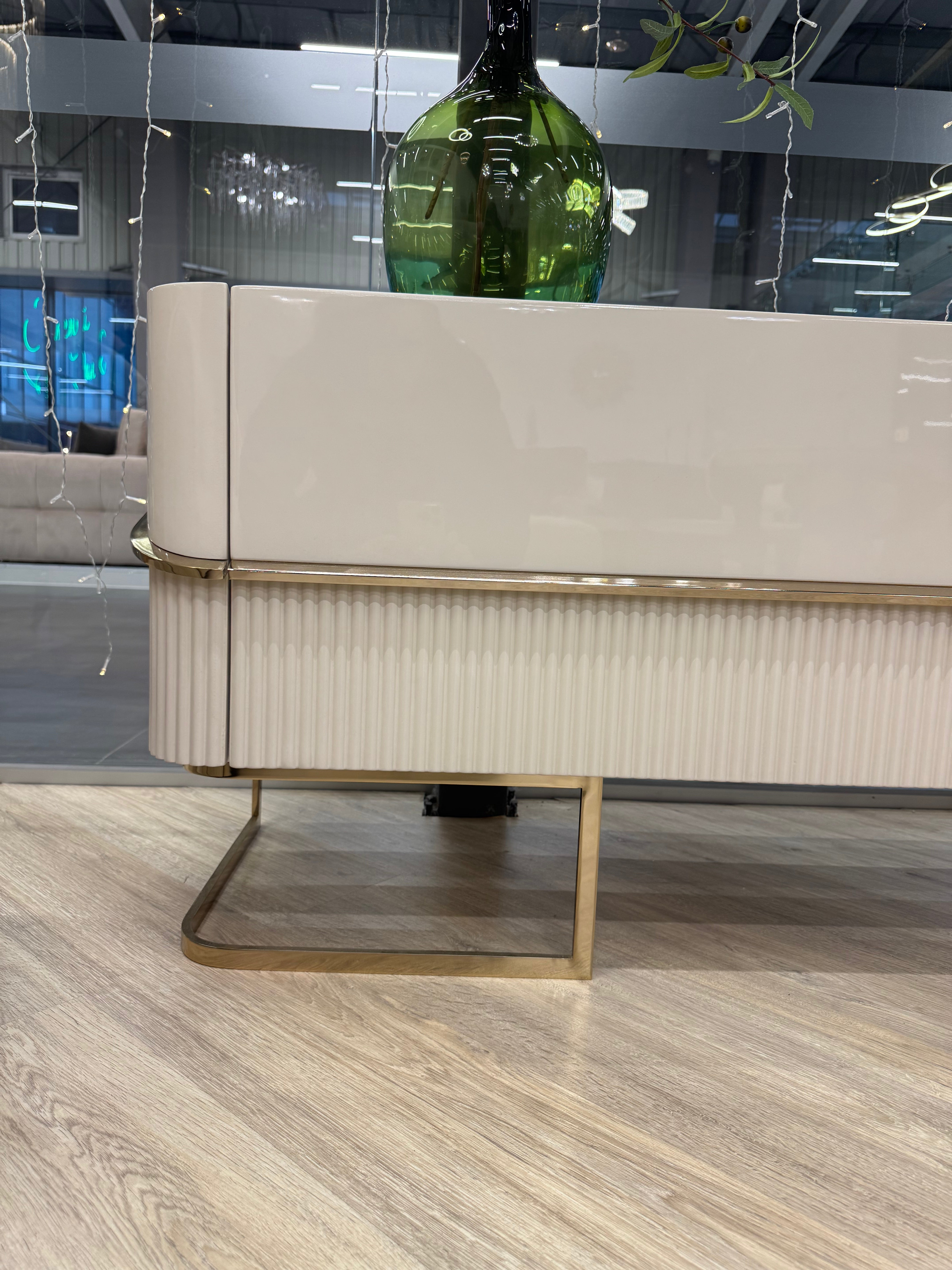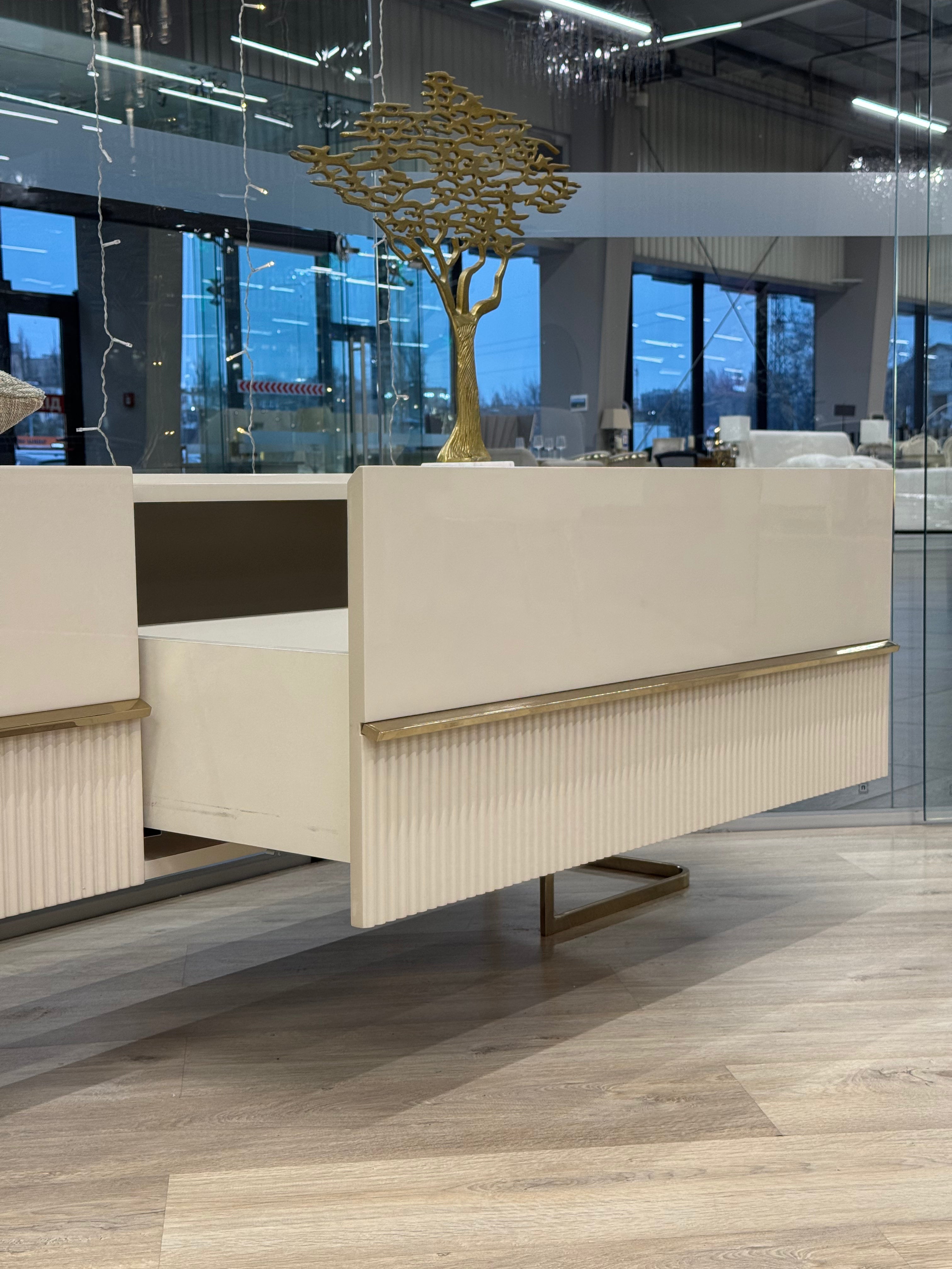 TV тумба OSCAR — це поєднання преміального дизайну та функціональності. Модель вирізняється елегантними формами, глянцевим фасадом і текстурованою нижньою панеллю, що додає інтер’єру глибини й стилю.