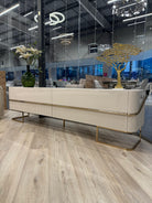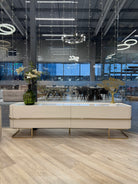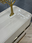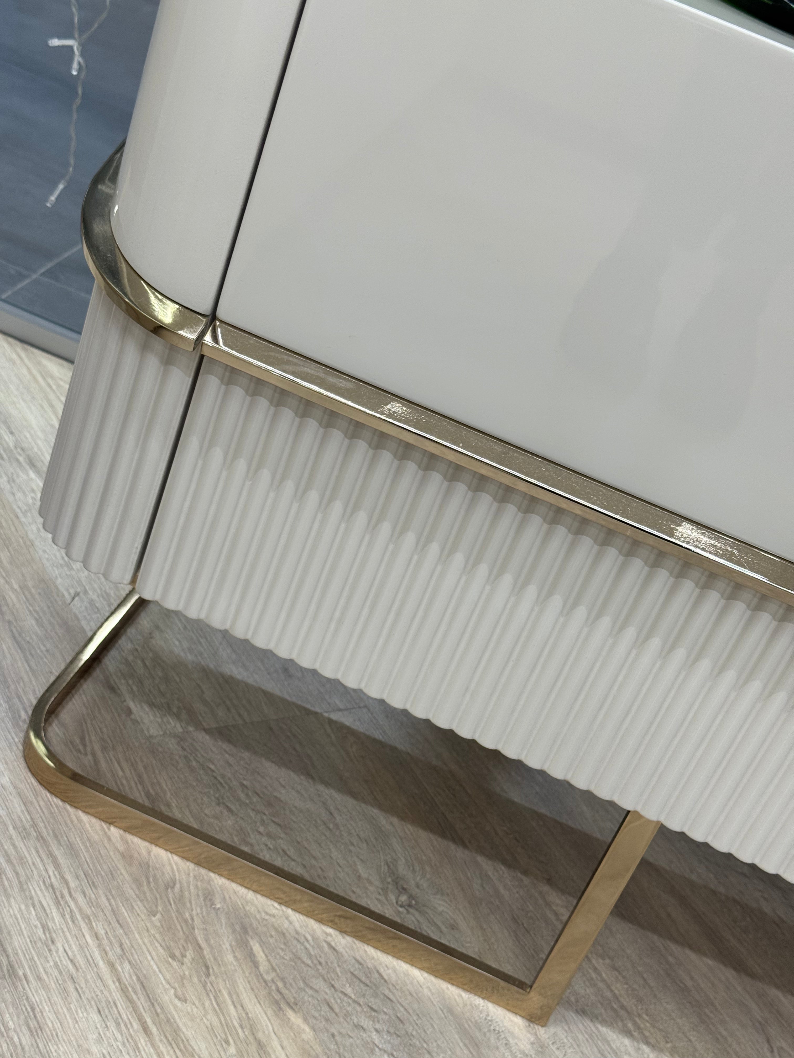 Металеві ніжки золотистого кольору забезпечують стійкість і створюють відчуття легкості, а продумана конструкція дозволяє комфортно розмістити техніку та аксесуари.