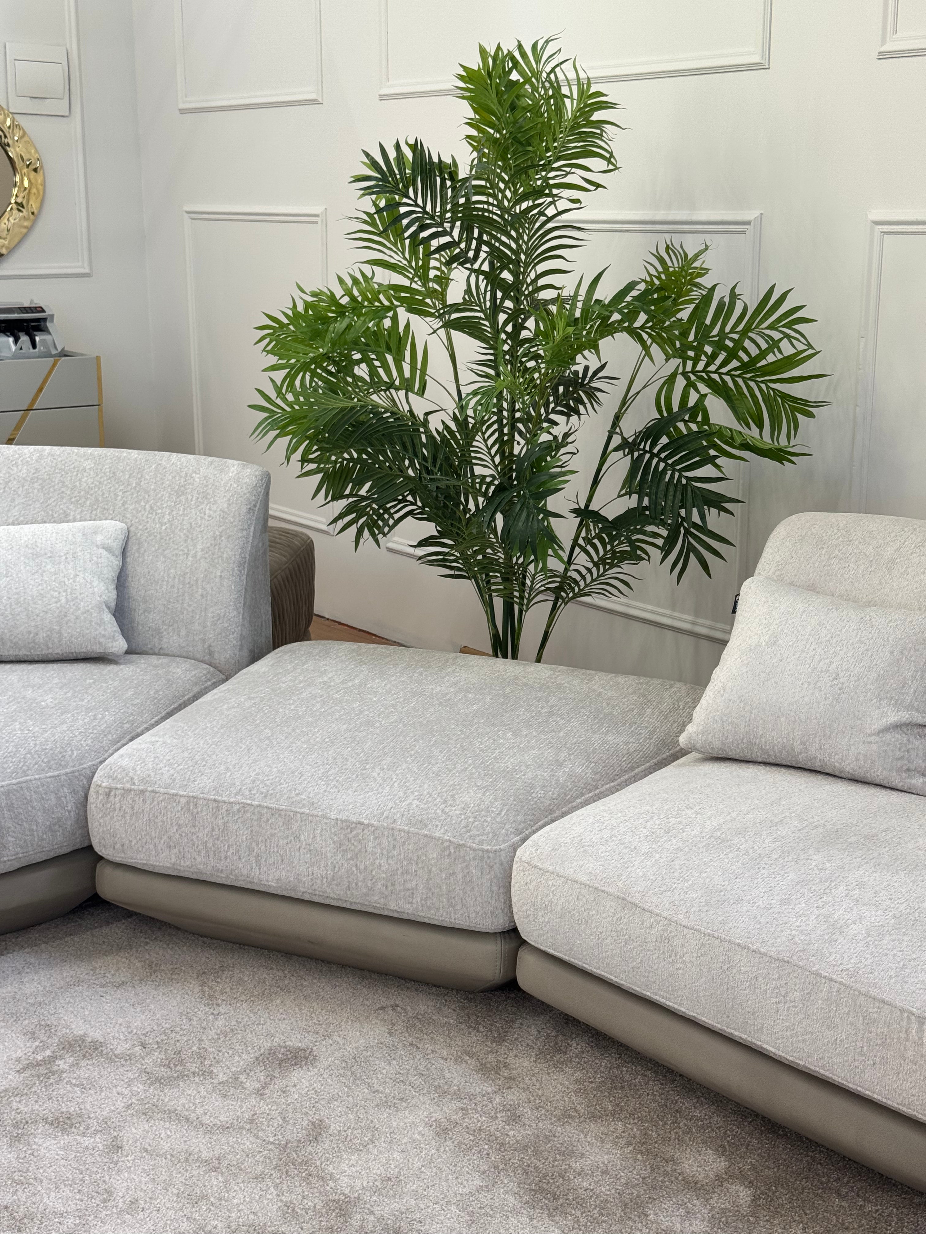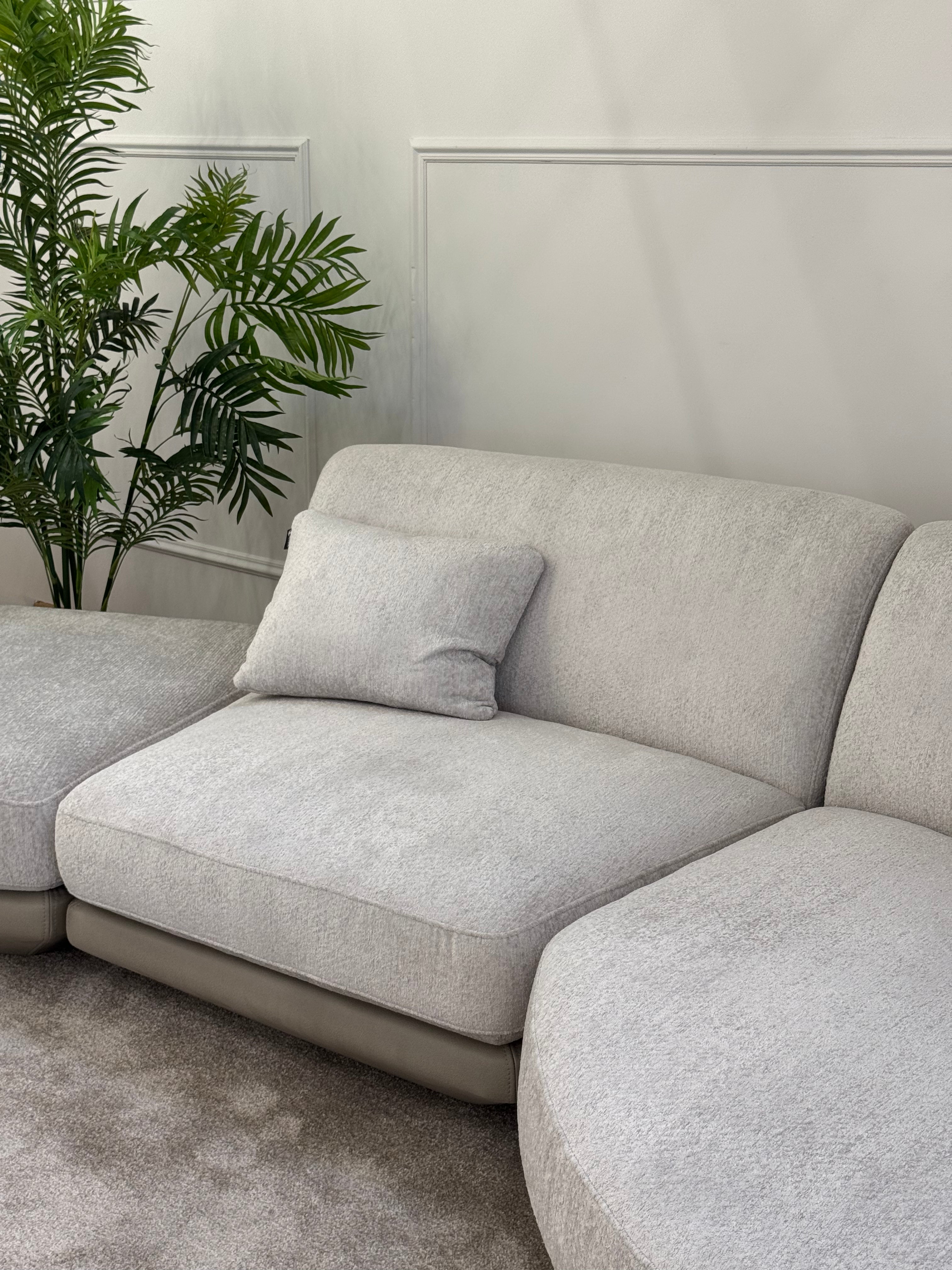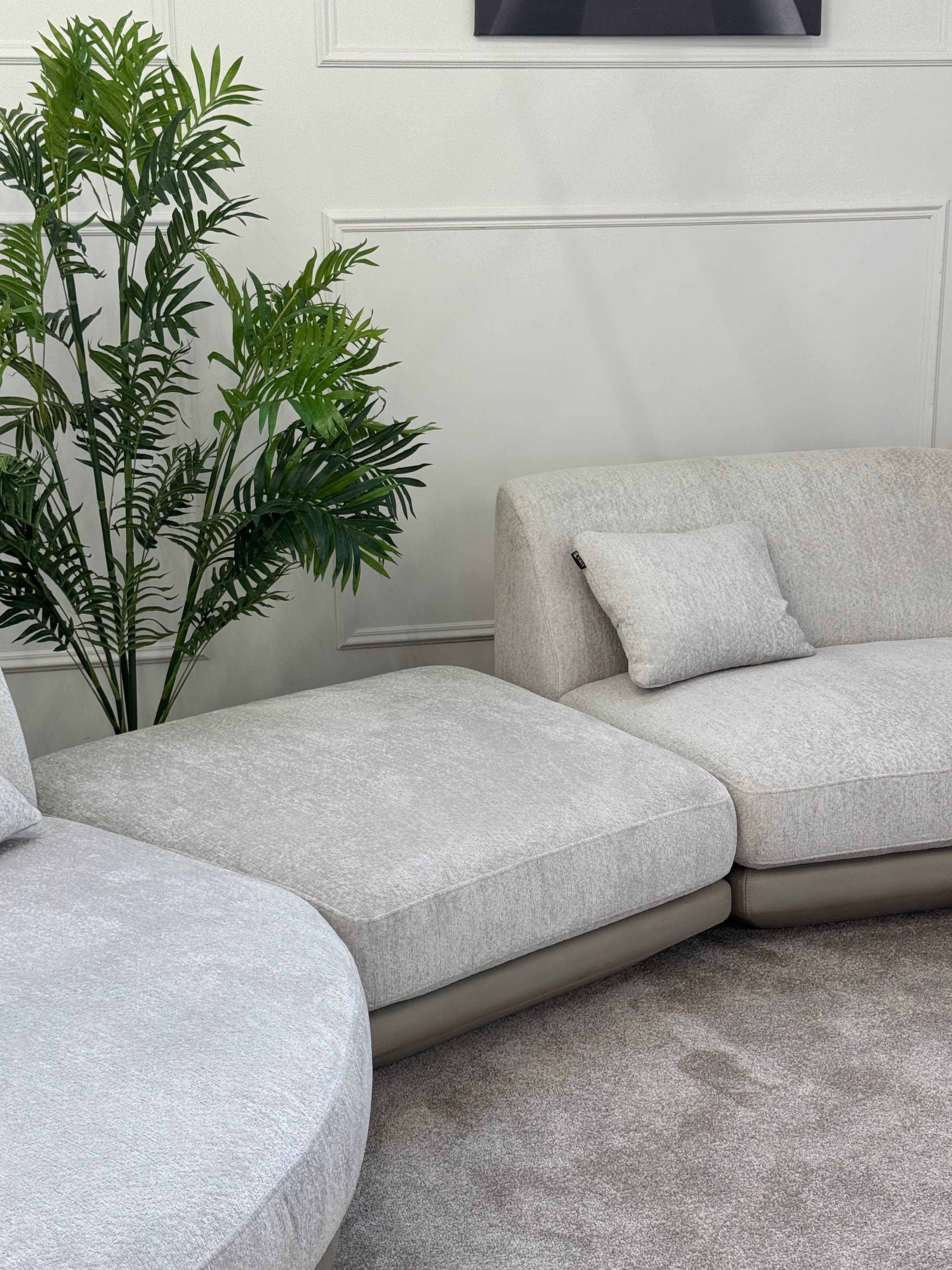 М’яка, приємна на дотик оббивка в ніжному сірому відтінку гармонійно виглядає в будь-якому інтер’єрі. Особливістю моделі є низька посадка та виражена округлість елементів — це надає дивану легкої скульптурності. Внизу — елегантне контрастне оздоблення, яке додає акценту, не порушуючи загальну мінімалістичну естетику.