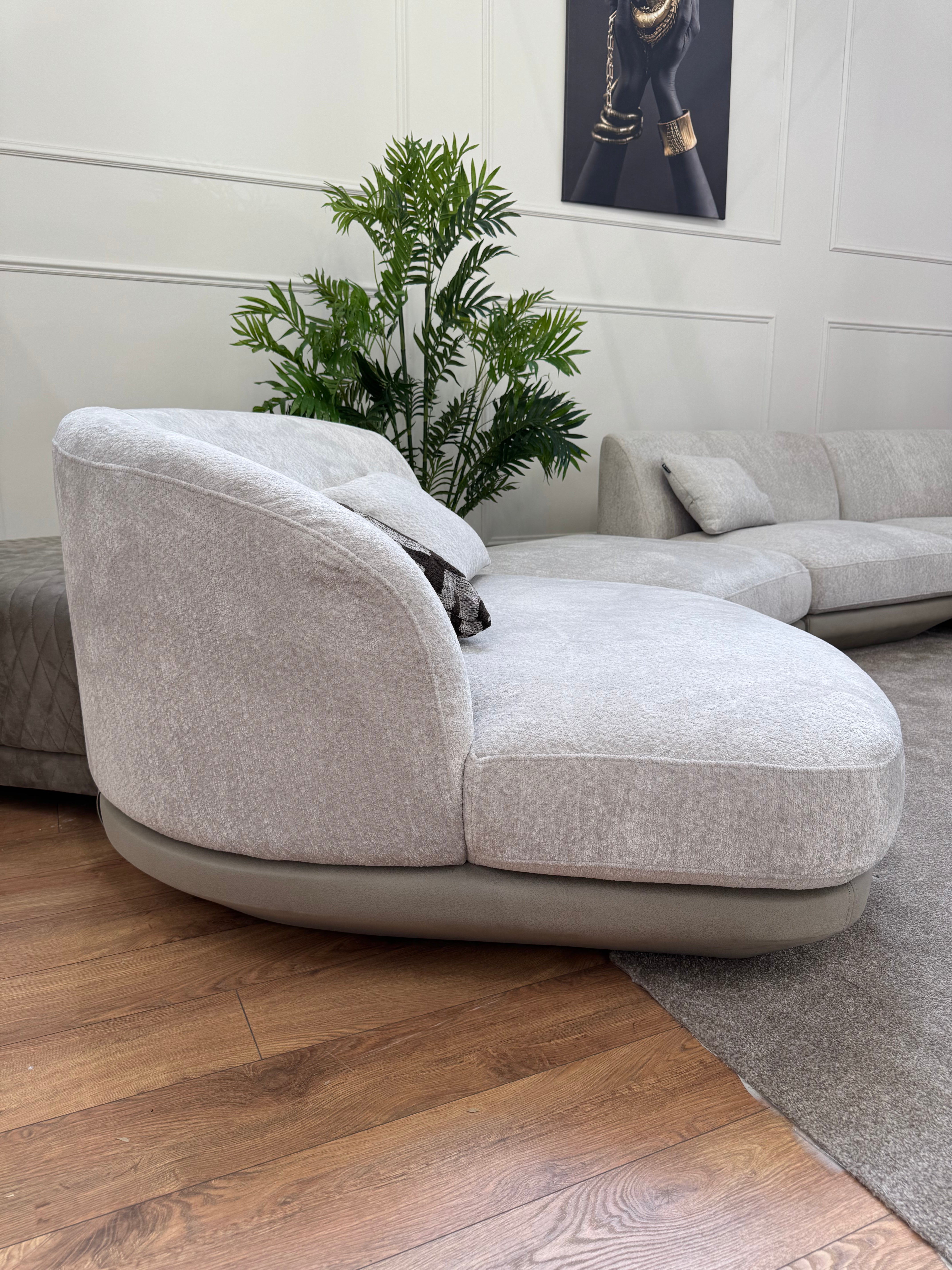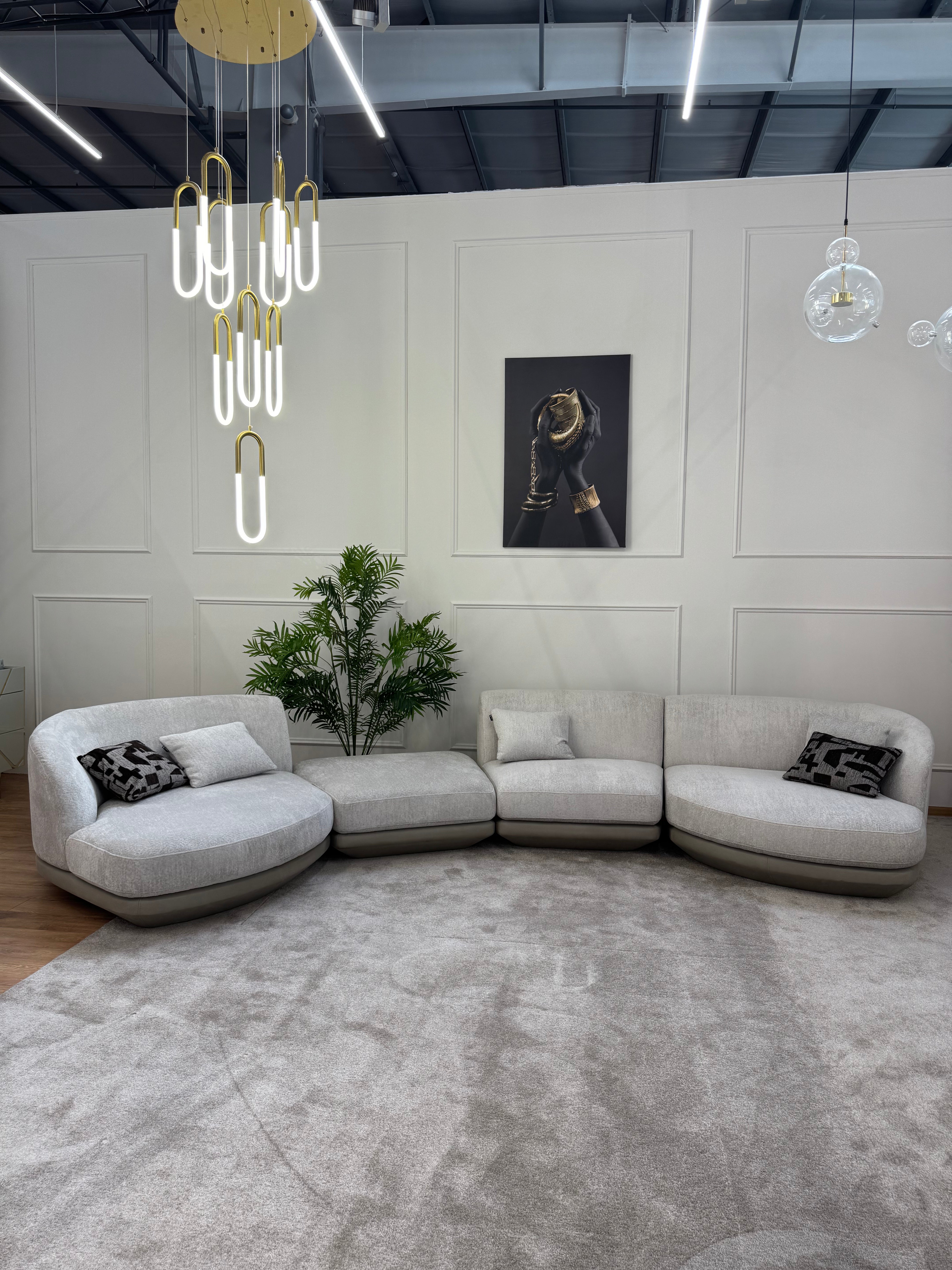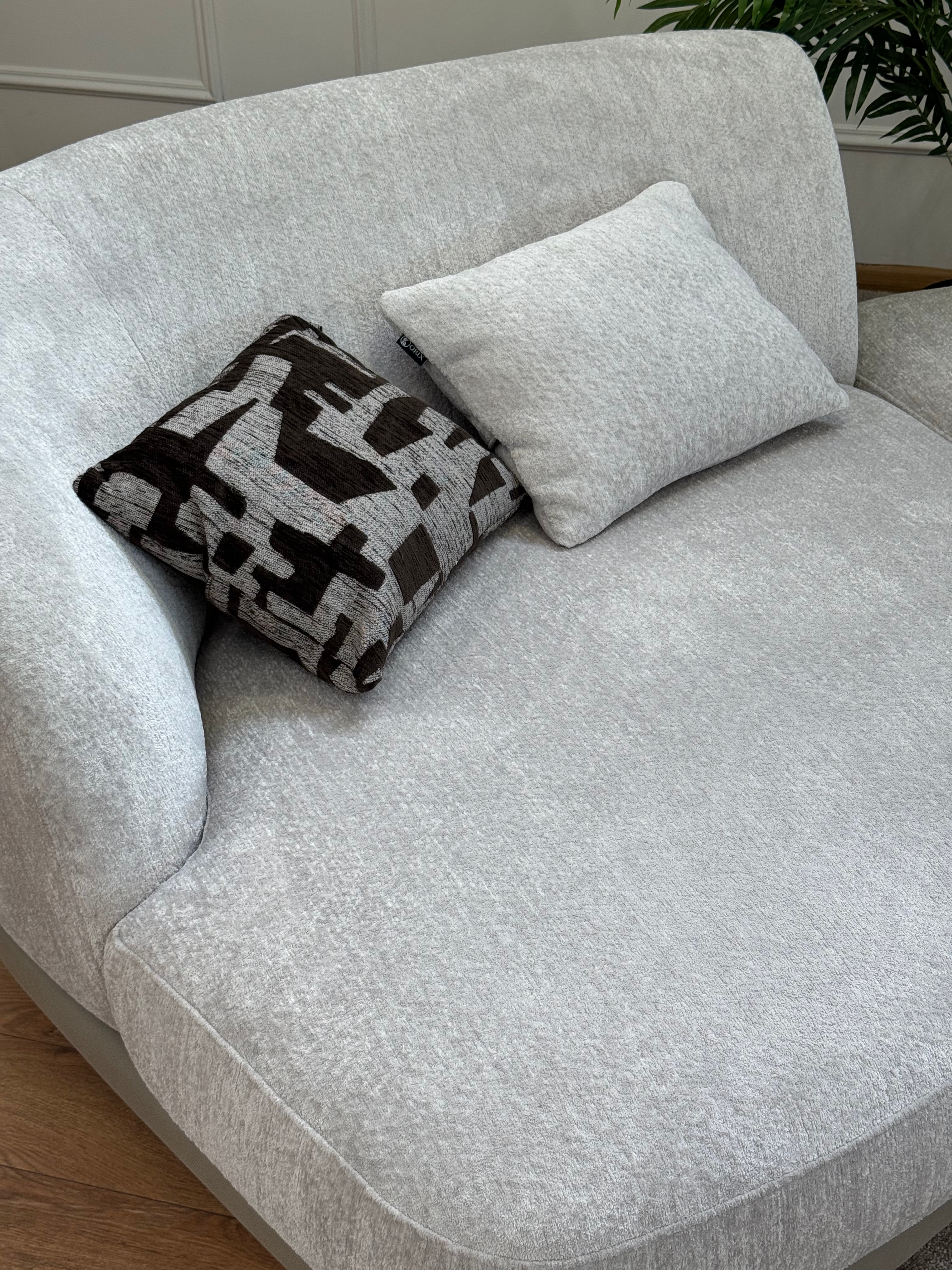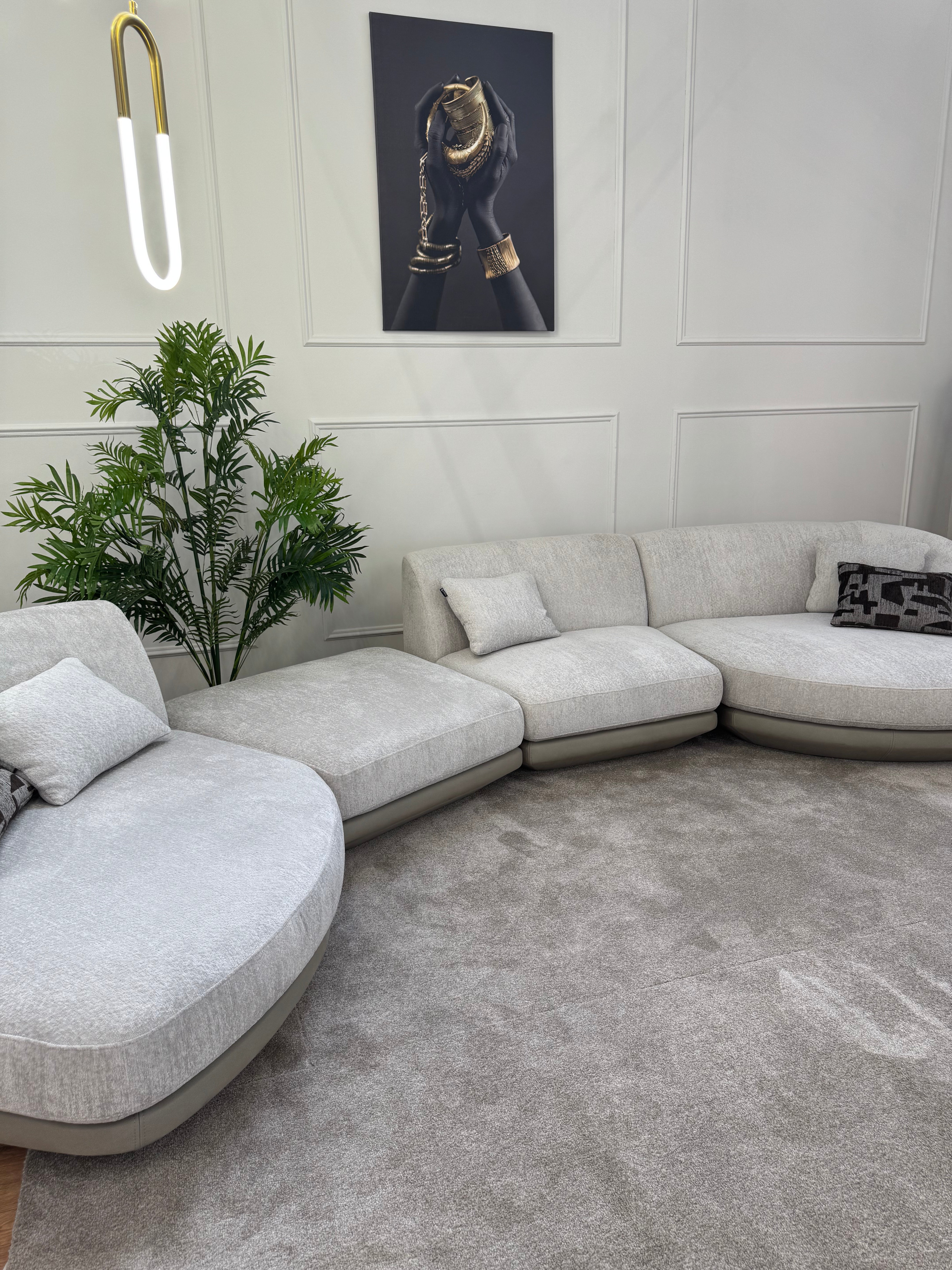 М’яка, приємна на дотик оббивка в ніжному сірому відтінку гармонійно виглядає в будь-якому інтер’єрі. Особливістю моделі є низька посадка та виражена округлість елементів — це надає дивану легкої скульптурності. Внизу — елегантне контрастне оздоблення, яке додає акценту, не порушуючи загальну мінімалістичну естетику.