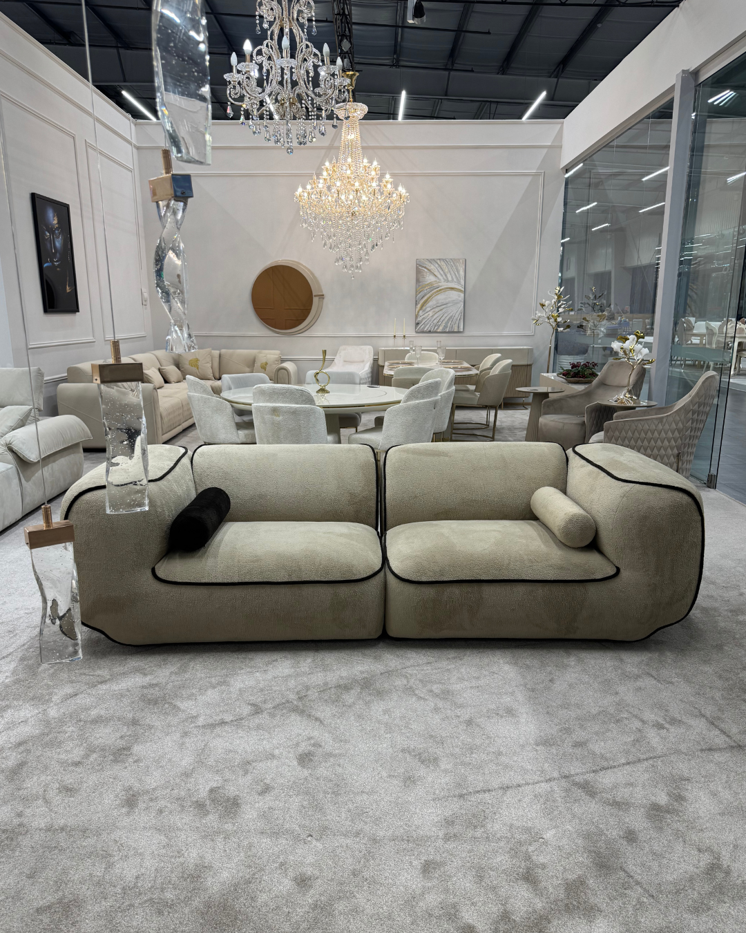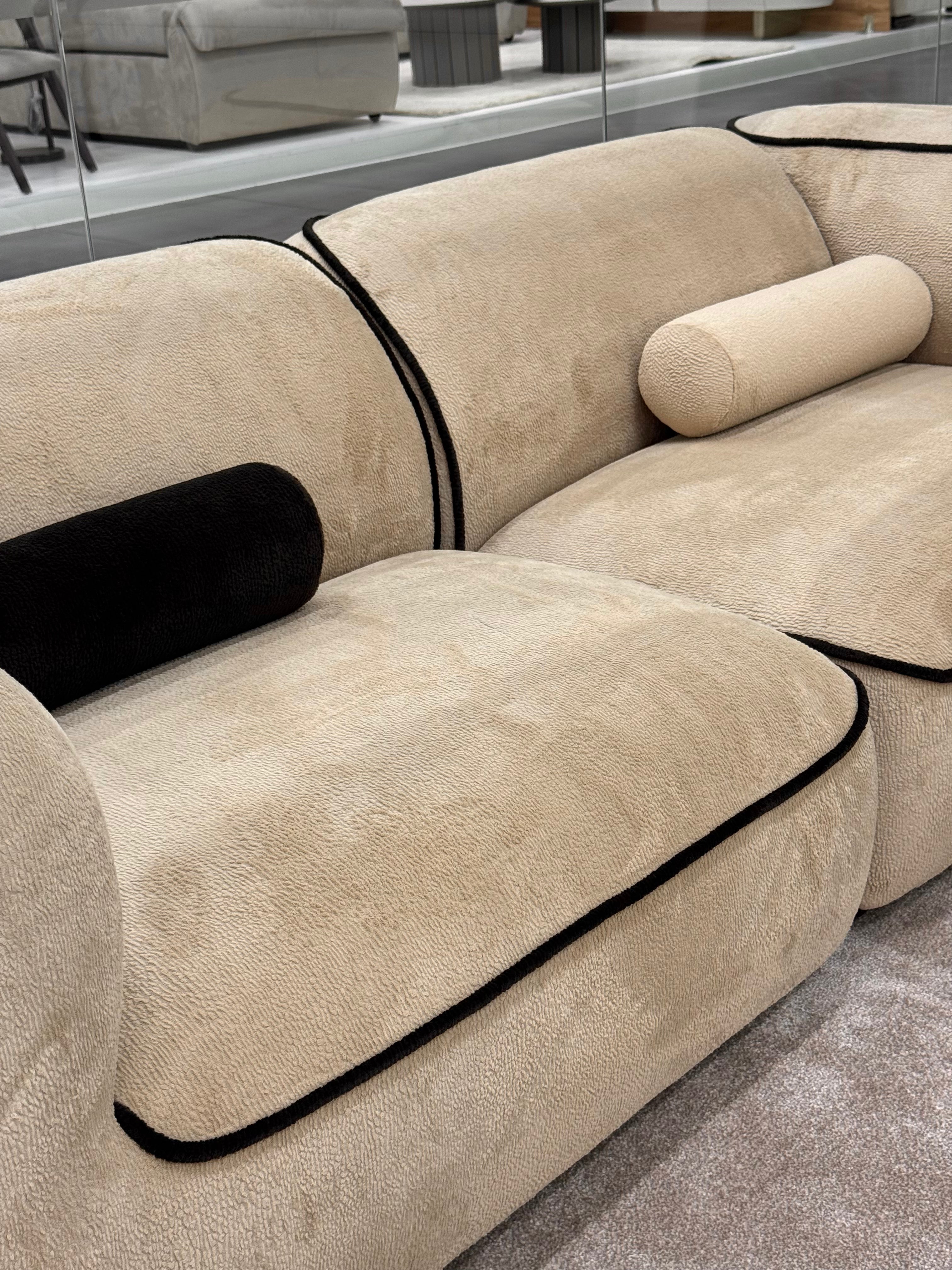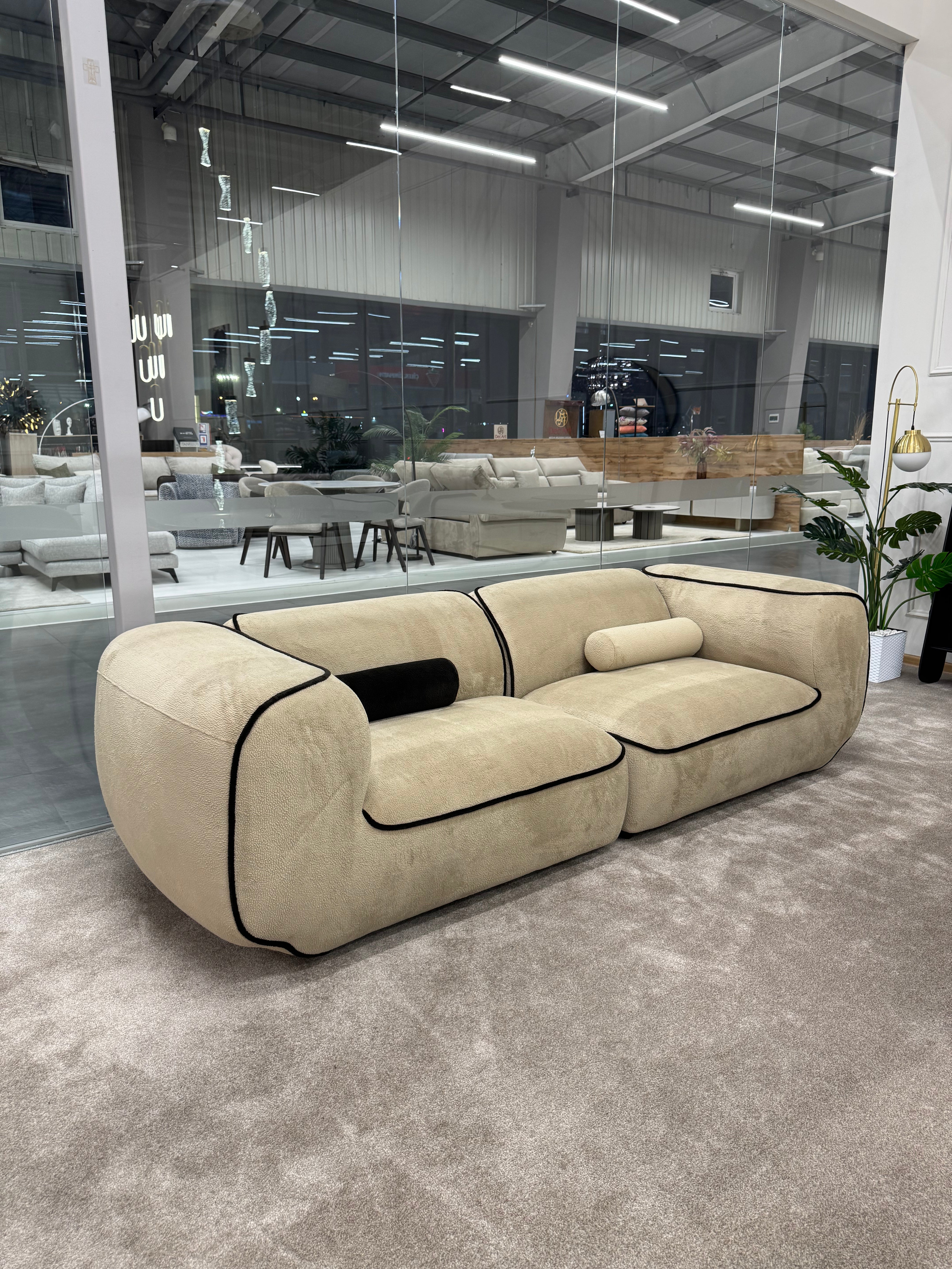 Його округлий силует, акуратні контури та контрастна окантовка роблять диван візуально легким, але водночас солідним. Глибока посадка та щільні подушки забезпечують комфорт як для щоденного відпочинку, так і для довгих вечорів у колі близьких.