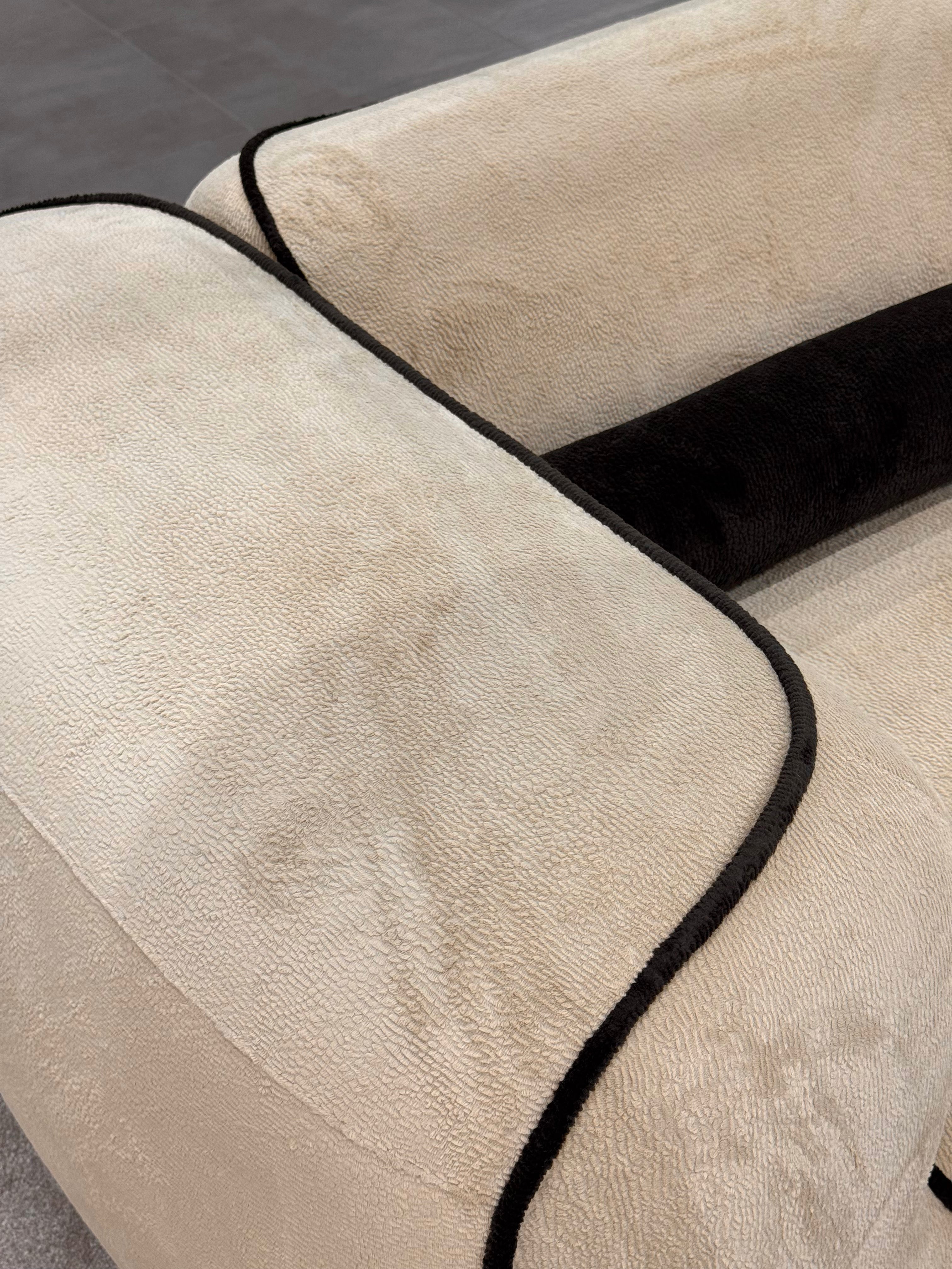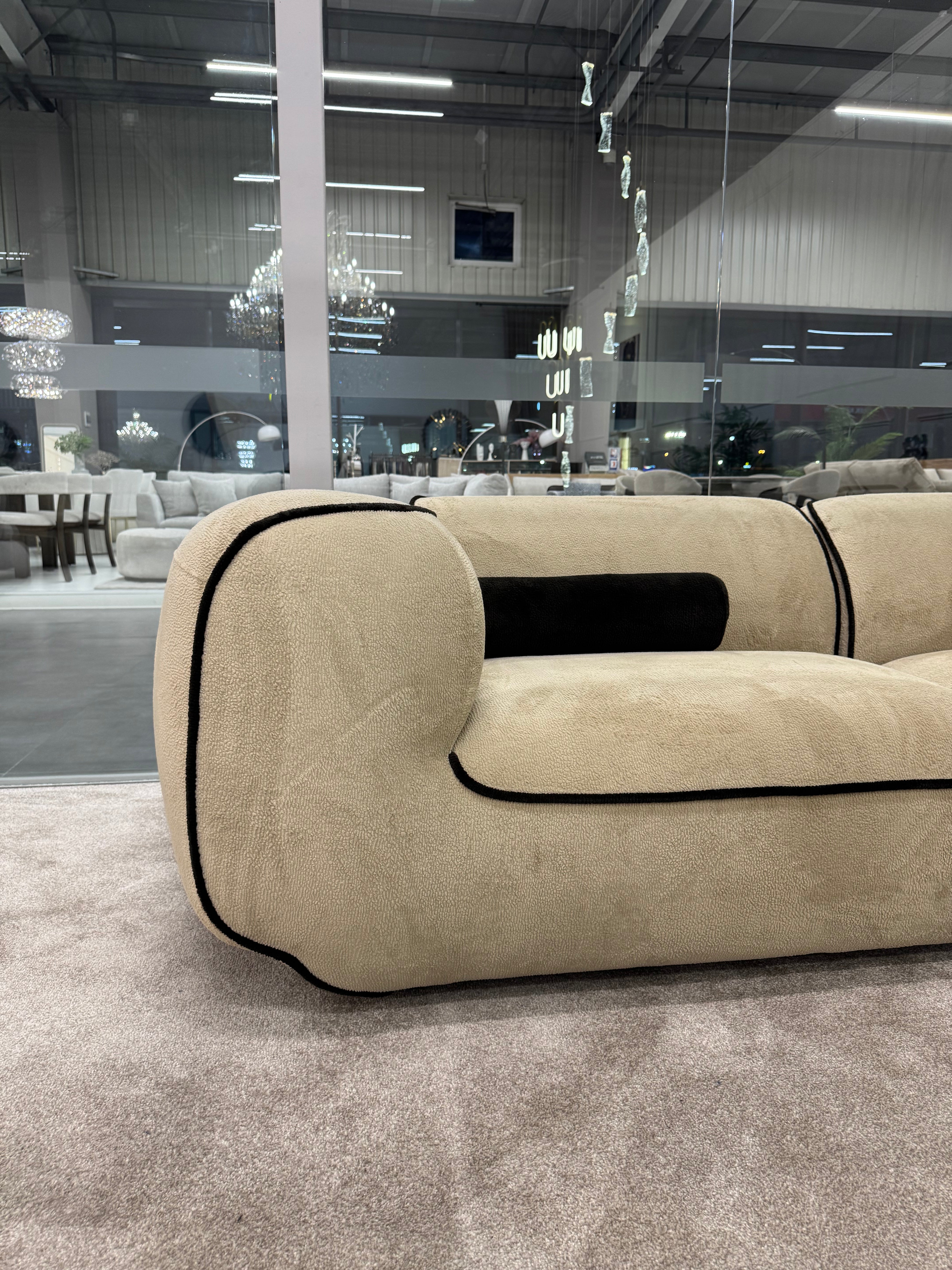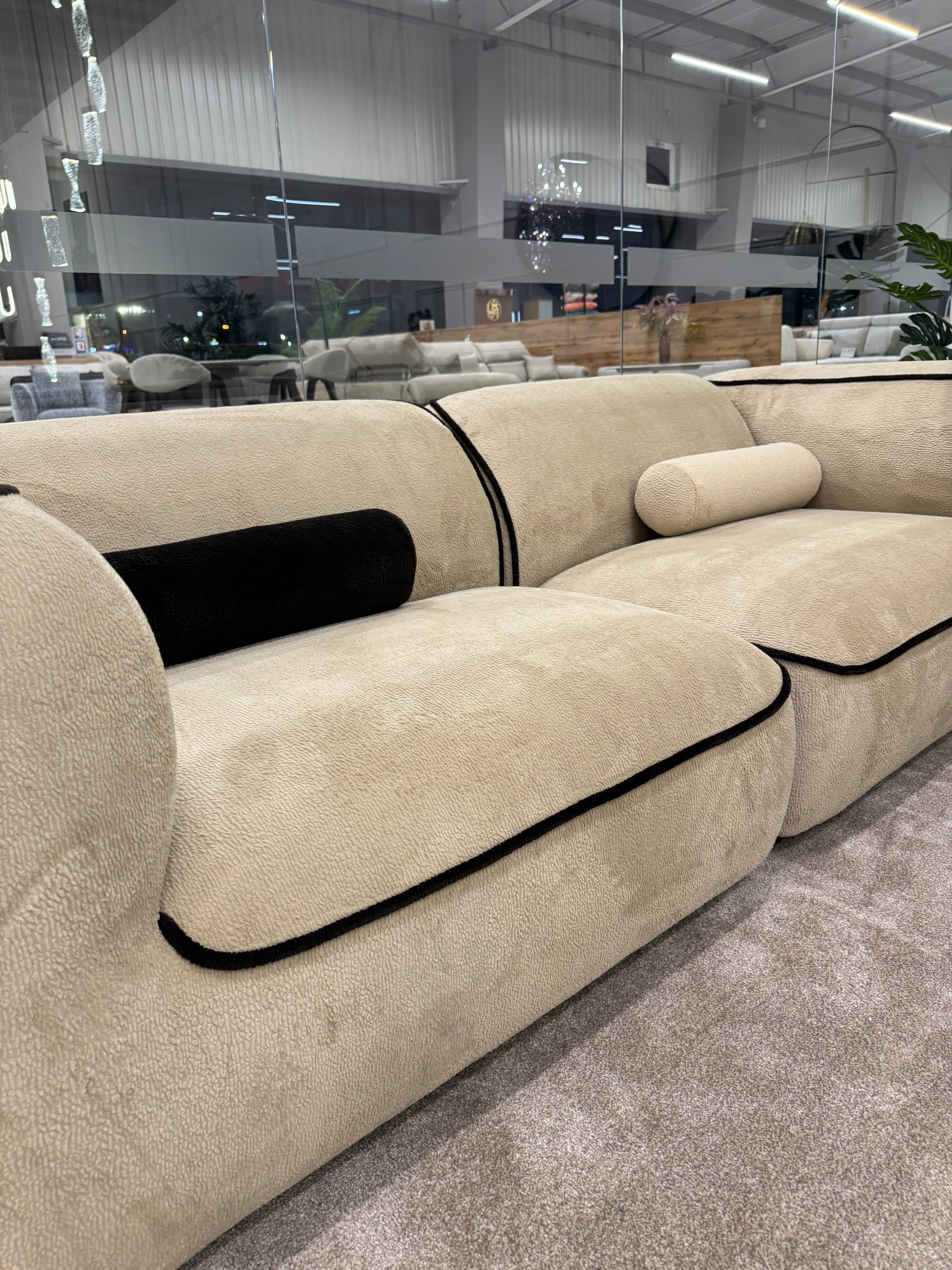 Його округлий силует, акуратні контури та контрастна окантовка роблять диван візуально легким, але водночас солідним. Глибока посадка та щільні подушки забезпечують комфорт як для щоденного відпочинку, так і для довгих вечорів у колі близьких.